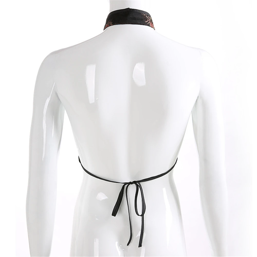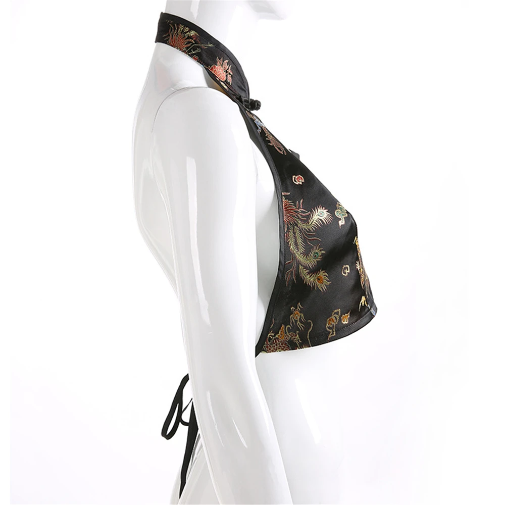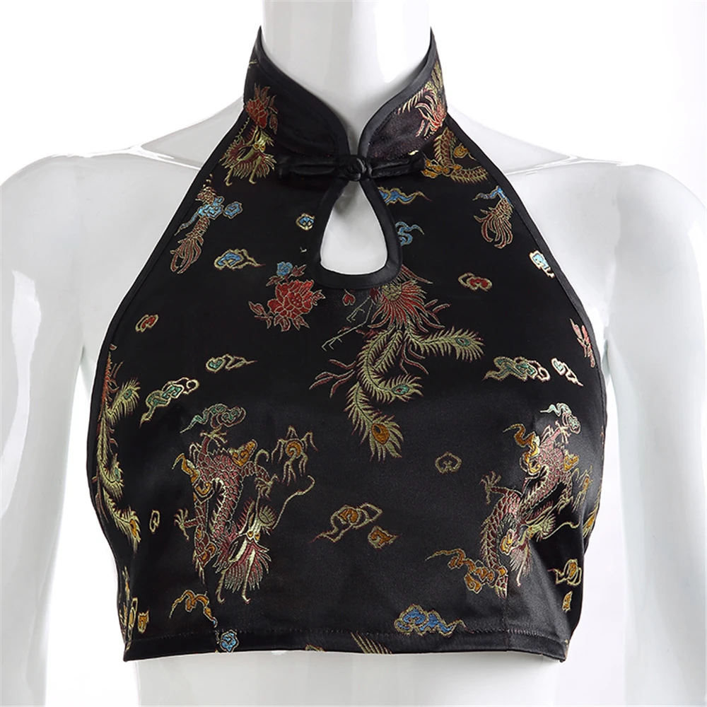 Винтажный короткий топ без косточек с вышивкой дракона в китайском стиле 2019, пикантные топы с открытой спиной и завязками на бретельках