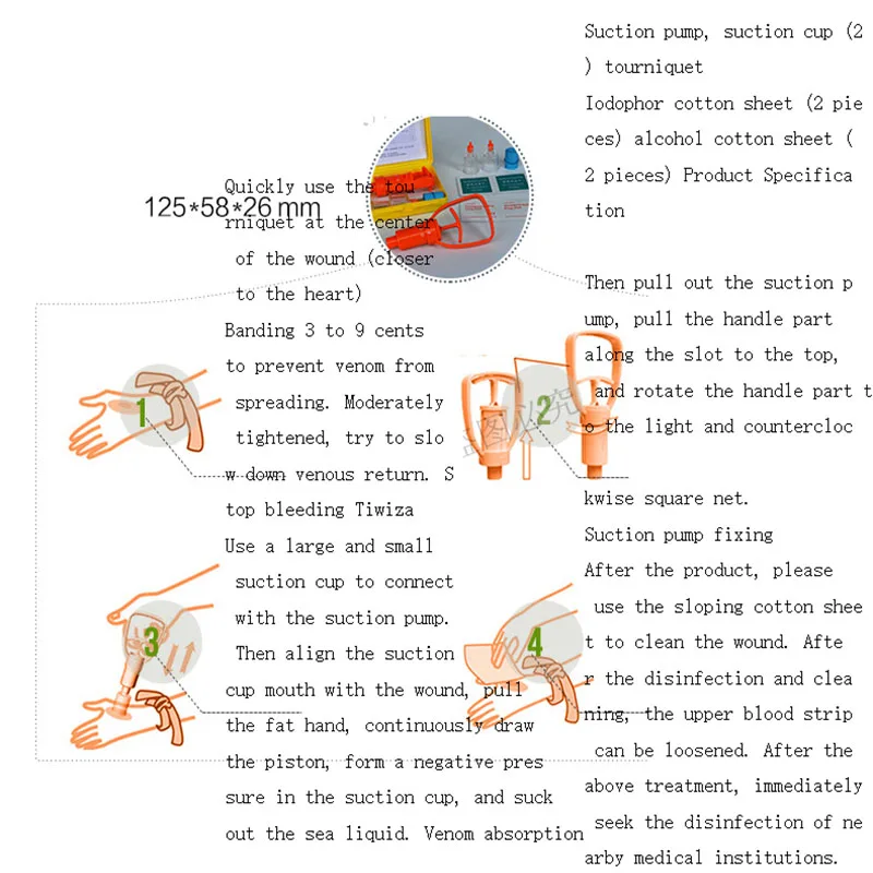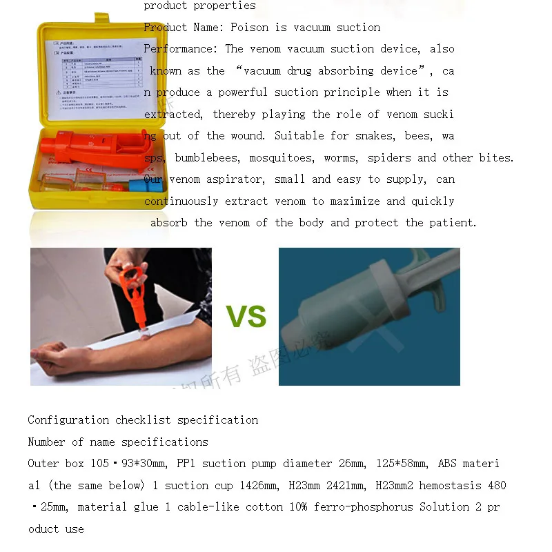 Особенности: Наш Веном аспиратор, маленький и портативный, может непрерывно извлекать яд, максимизирует и быстро поглощает яд тела, защищает пациента