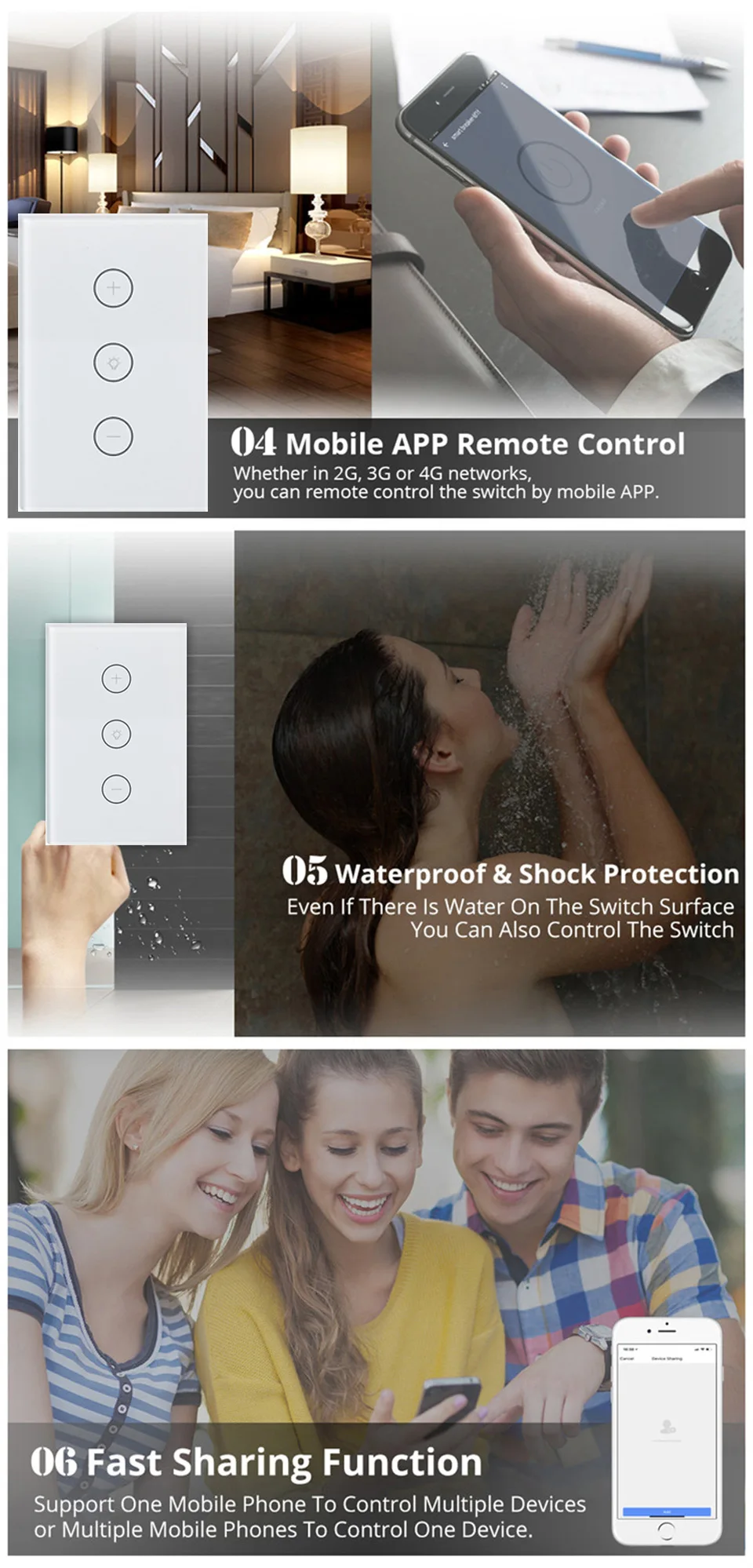 1. Голосовое управление: Как только у вас есть этот коммутатор, вы можете подключить его к Amazon Alexa(Amazon echo/dot/tap) или Google Assistant для голосового управления. 2. Пульт дистанционного управления Wi-Fi: вы можете использовать приложение "Smart Life" в вашем смартфоне для управления настенным переключателем по беспроводной сети с помощью Wi-Fi или сети 4G. Не требуется концентратор. 3. Функция синхронизации: Возьмите полный контроль над своим домом или офисным освещением благодаря таймеру расписания, который позволит вам спланировать точное время для автоматического включения/выключения ламп и приборов 4. Совместно используемое устройство: Этот светильник samrt может иметь несколько узлов управления, которыми пользуются различные члены семьи. Один мобильный телефон также может управлять многими переключателями. 5. Добавьте больше функций с IFTTT: «Если это так, то это 'бесплатная веб-служба, которая позволяет вам делать удивительные thins с переключателем на светильник, поворотными лампами, вентиляторы или другая Электроника до того, как вы вернетесь домой или уедете, с IFTTT