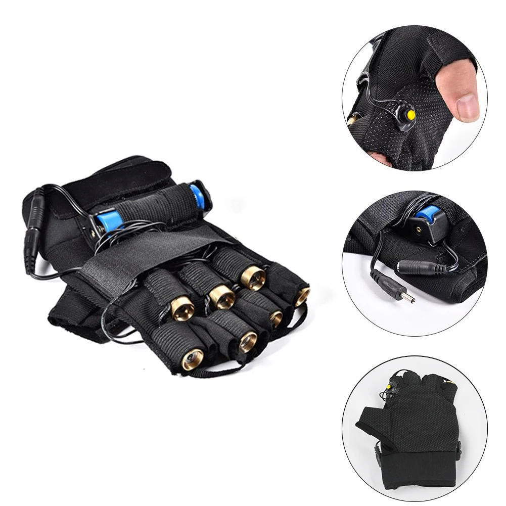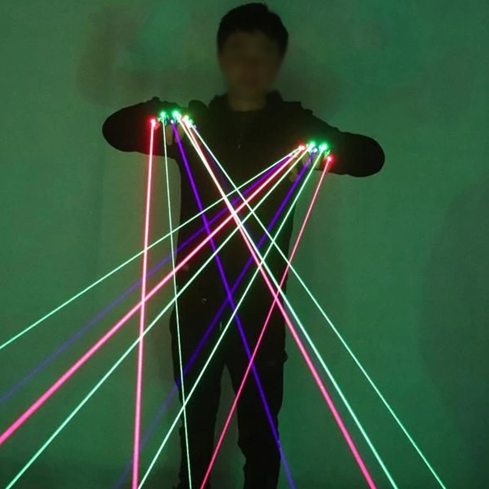 Specification: Light source type: laser Voltage: 5v 3pcs Green light: 532nm; 2pcs Red light: 650nm ; 2pcs violet: 405nm ; Color temperature: red / green / purple Product body material: nylon fabric + aluminum alloy + brass Waterproof and dustproof rating: ip20 Charging method: plug charging Product size: about 16cmx10cm ; Adjust the elastic by adjusting the wrist strap Scope of application: entertainment parties, performances, evening parties, dance programs, nightclubs, street dances and other gathering occasions to adjust the atmosphere and interact with the audience. Switch type: button Life time: 2h Service life: 3 years Package including: gloves *1 charger * 1 change point laser head * 7