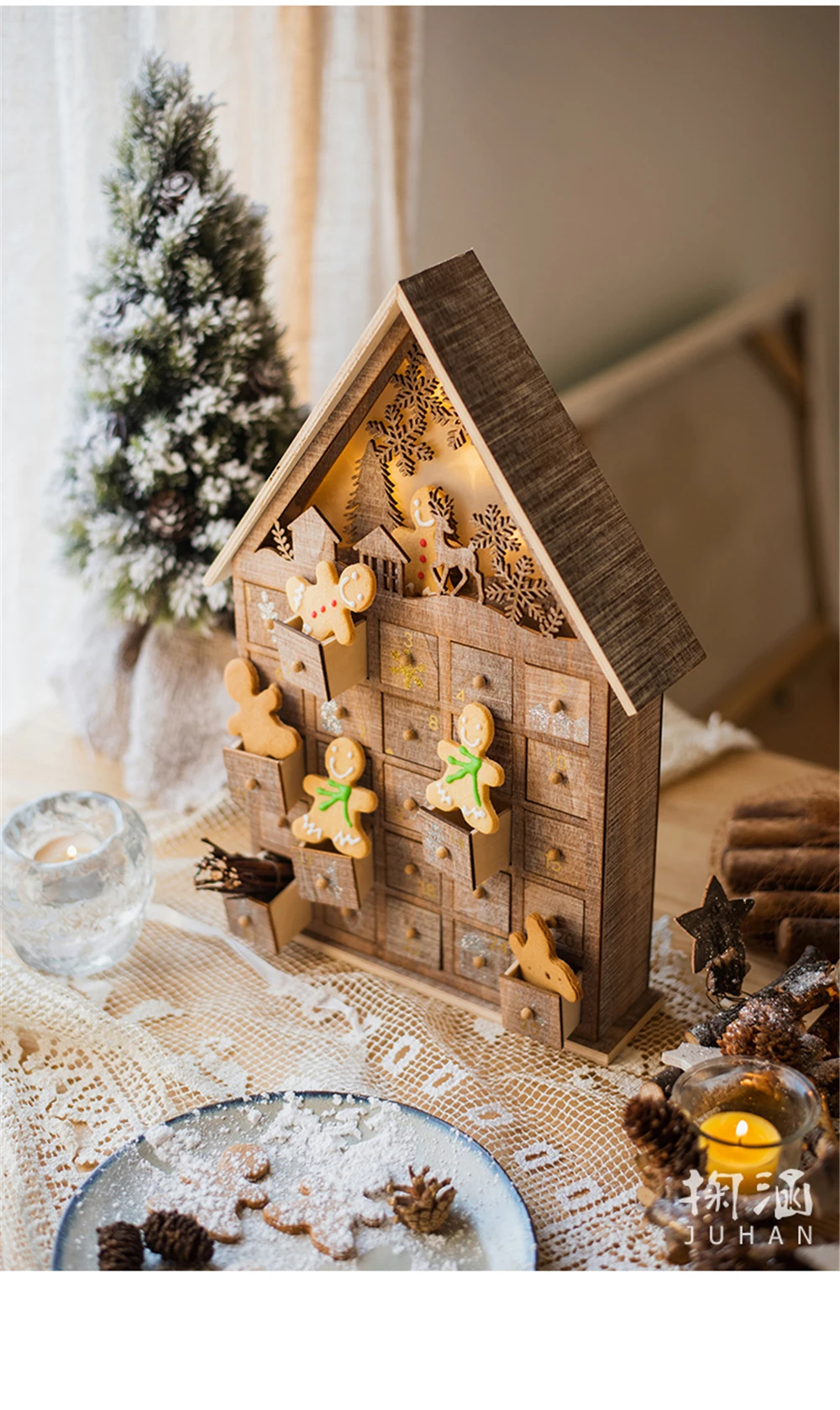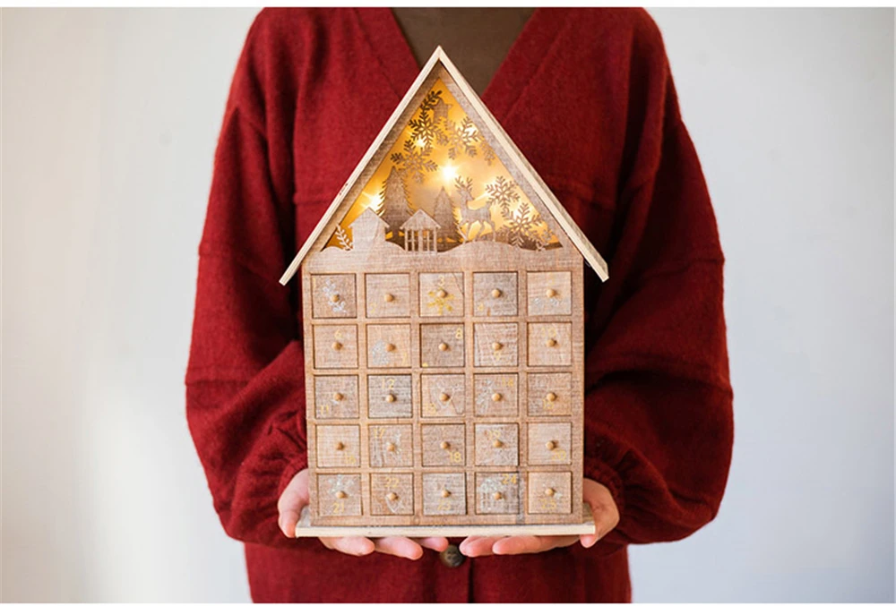 Материал:Дерево Размеры:Рождественский календарь - 37,5 см x 25 см x 6 см (14,76 дюймов * 9,84 дюймов * 2,36 дюймов) одного ящика-5 см x 3 см x 3 см (1,97 дюймов * 1,18 дюймов * 1,18 дюймов) Функция:Декоративные украшения для магазина, рождественские украшения для дома, подарок для детей и т. д. Мощность:2 штуки Элементов питания типа AAA