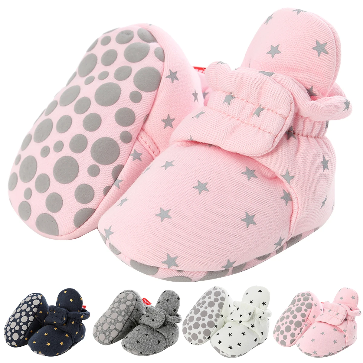 Комплект одежды для новорожденного мальчика и девочки, детские носки обувь со звездами для маленьких девочек; Первая обувь для ходьбы, ботинки зимние хлопковые мягкие носки с противоскользящим покрытием; Нескользящие теплые туфли для младенцев, для маленьких