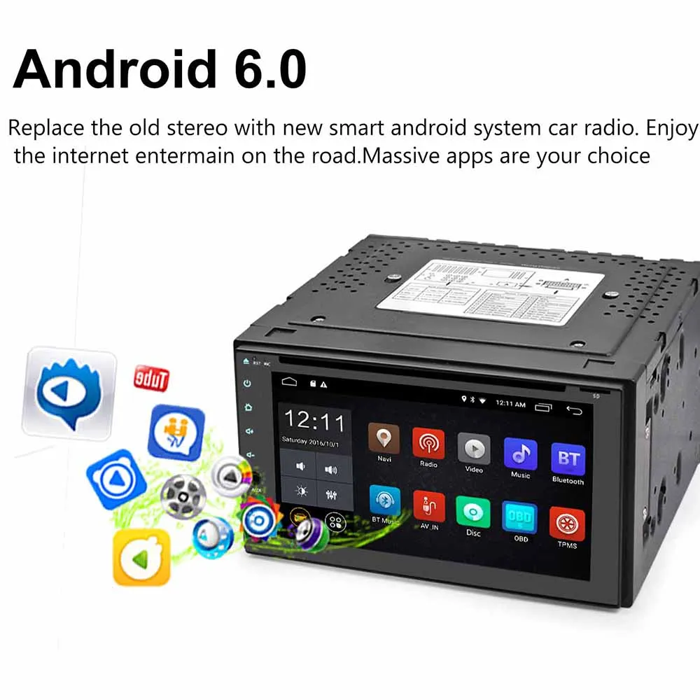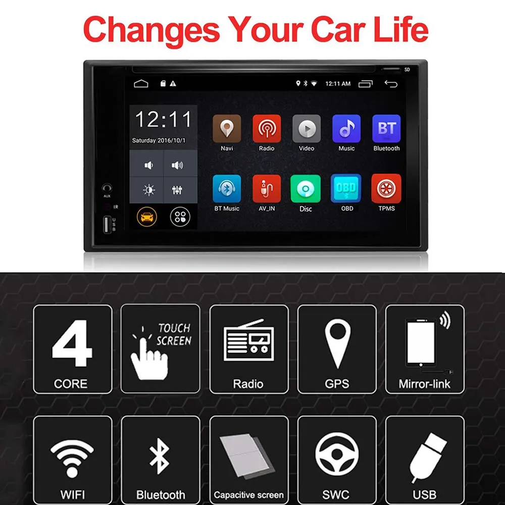 Единичные функции: 2 DIN 6,2 дюймов TFT ёмкостный тач-Экран. Android 6,0 системы Высококачественная модель с разрешением 800x480 пикселей CPU 1,6G четырехъядерный процессор с 1G DDR3 VCD dvd/VCD/CD/MP3 плеер с передним sd-входом, задним входом USB Встроенный 16G флэш-память для музыки/навигационной карты данных/видео Radio am/FM/R.D.S радио, автоматический магазин памяти/предустановленное сканирование Зеркальная линза для смартфона Встроенный Bluetooth 4,0 с A2DP/Hands Free/телефонная книга Встроенный gps-приемник, совместимый с Waze/Navfree/Google Map и т. д. Back Камера Вход Preset мульти настройки эквалайзера Громкость/фейдер/баланс/высокие частоты/регулятор басов Совместимость мультимедийного проигрывателя со всеми форматами 4x45 вт Мощность Выход 4-канальный RCA/Sub выход 4,1 2 канала видео Выход Rear AV вход Build в WI-FI Управление рулевым колесом