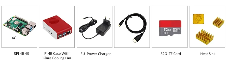 1.Raspberry Pi 4 модель B-4GB RAM 2. Корпус Pi 4B С бликовым охлаждающим вентилятором 3.EU адаптер питания 5 В 3A питания Type-C 4.Raspberry Pi 4 Модель B HDMI-совместимый 5,32G TF карта 6.Raspberry Pi 4 Модель B радиатор