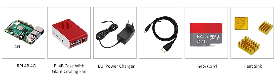 1.Raspberry Pi 4 модель B-4GB RAM 2. Корпус Pi 4B С бликовым охлаждающим вентилятором 3.EU адаптер питания 5 В 3A питания Type-C 4.Raspberry Pi 4 Модель B HDMI-совместимый 5,64G TF карта 6.Raspberry Pi 4 Модель B радиатор