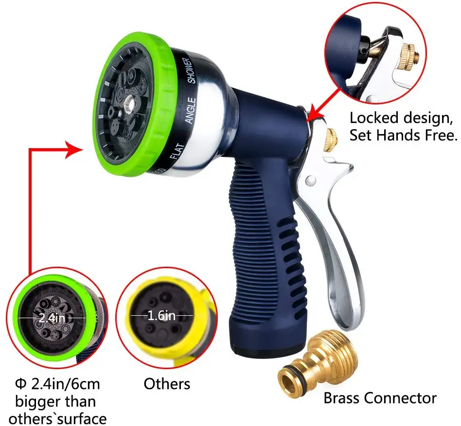 1. Защита от протечек-оба корпуса и рукоятки изготовлены из высококачественного твердого цинкового сплава, прочная металлическая конструкция обеспечивает долгий срок службы для нашего садового распылителя, латунный шланговый Соединитель с резиновой втулкой делает этот 100% герметичный.