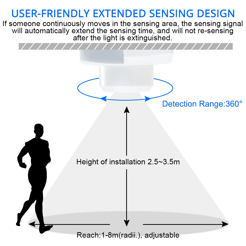 Если кто-то постоянно движется в чувствительной области, сигнал срабатывания автоматически продлевает время срабатывания и не будет воспринимать его после того, как светильник будет отключен.