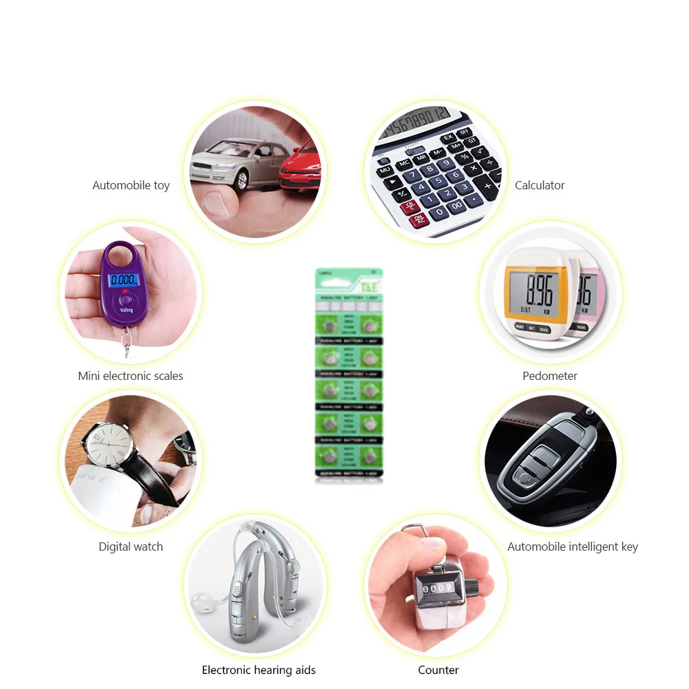 Лазерные указки, часы, часы, калькуляторы, компьютеры, камеры, цифровые камеры, КПК, пульты дистанционного управления, видеокамеры, электронные игры, электронные инструменты, MP3-плееры, цифровые диктофоны, игрушки, глюкоза в крови, измеритель уровня холестерина, сотни других электронных продуктов