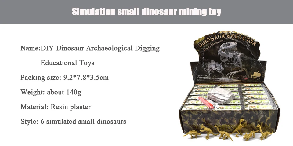 [Материал изделия]: полимерный гипс [Стиль изделия]: внутри 6 динозавров. [Размер изделия]: Д. 9,2 x Ш. 7,8 x Т 3,5 см [Упаковка]: упаковка одного цвета [Земляных работ шаги] 1. Перед началом раскопок, пожалуйста, подготовьте кусок бумаги под гипсовым блоком, чтобы предотвратить рассыпку гипсового порошка во время раскопок. Затем используйте бамбуковую палочку, чтобы аккуратно выкопать поверхность штукатурки и начать копать. 2. В процессе раскопок, пожалуйста, будьте внимательны и испытите удовольствие от раскопок. При копании костных окаменелостей используйте кисть для очистки каменной поверхности порошка, затем очистите костные окаменелости, протрите их и высушите.