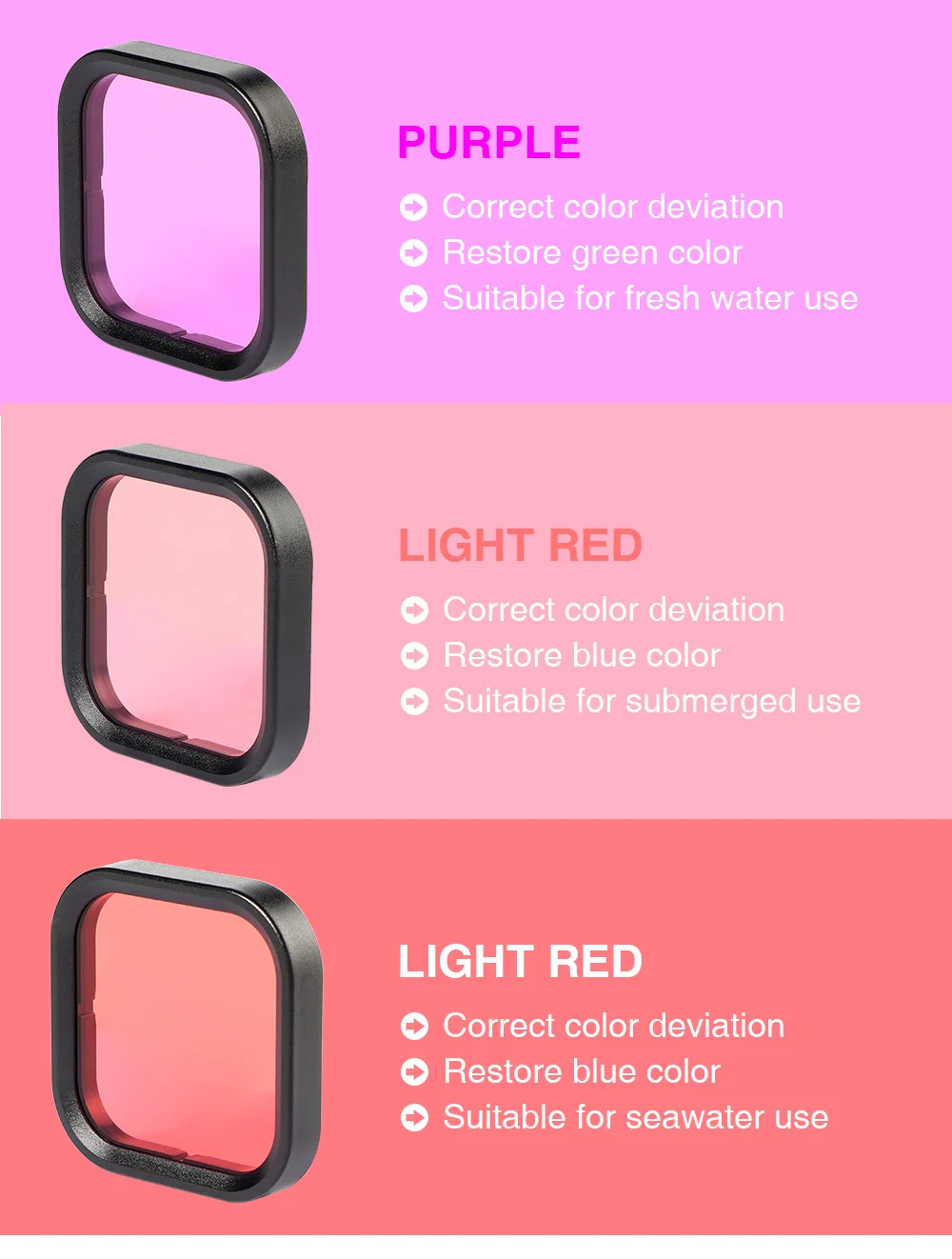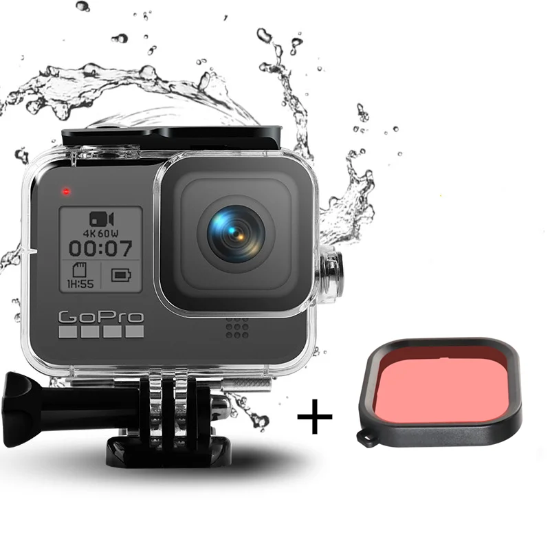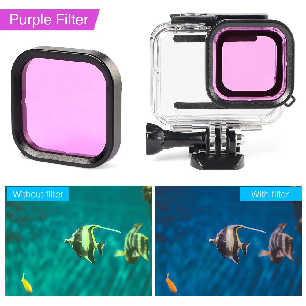 Легко прикрепить/выключить фильтр к водонепроницаемому корпусу чехол для GoPro Hero 8. Не забудьте использовать предоставленные тросы для петли фильтра в водонепроницаемом корпусе, Избегайте потери фильтра во время дайвинга.