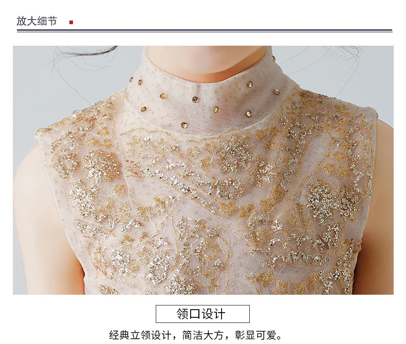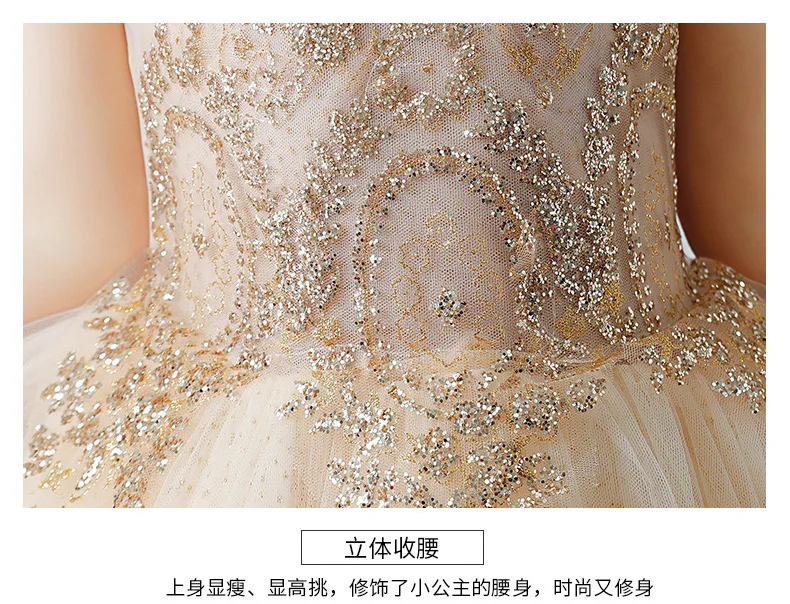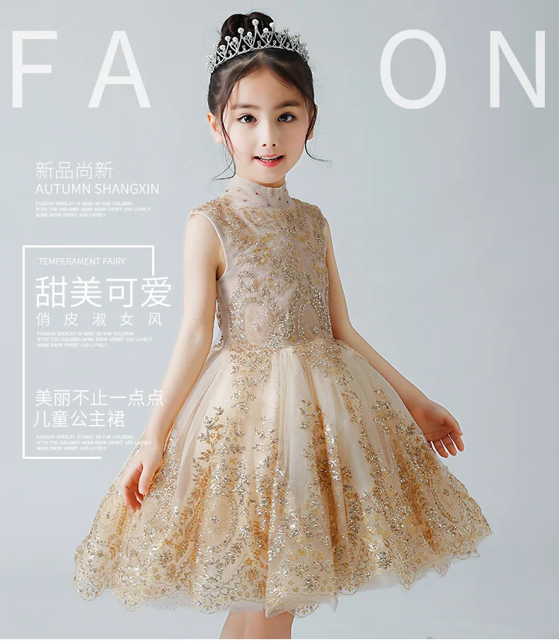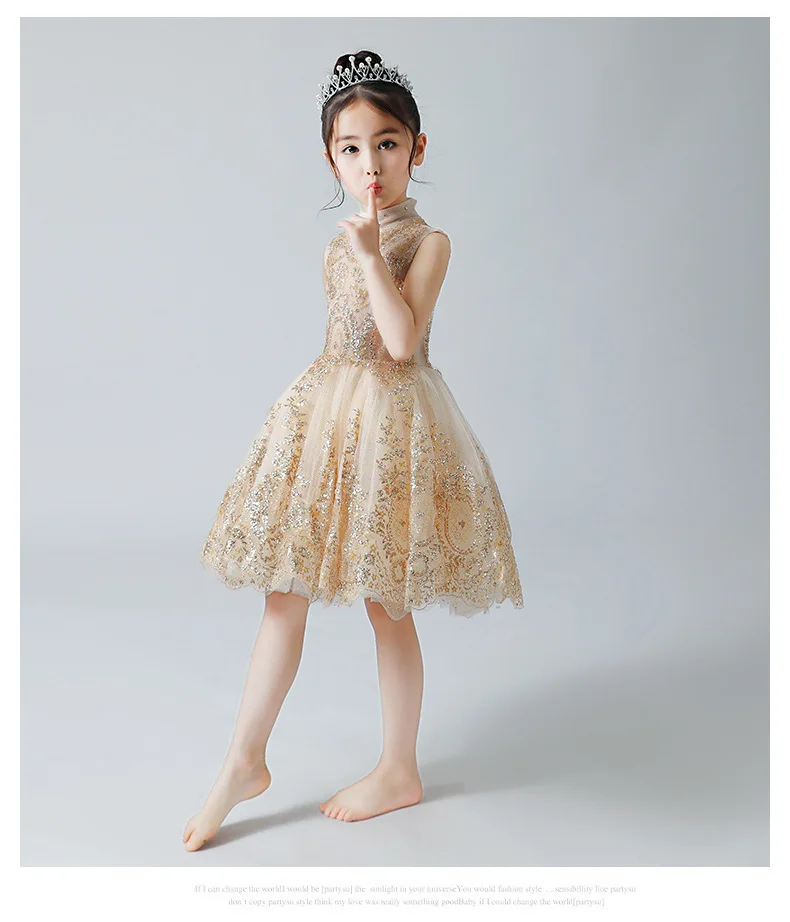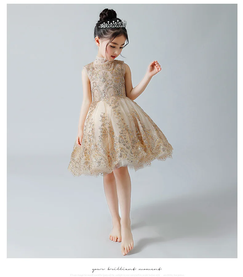 Королевским цветочным Платье для маленьких девочек для свадьбы кружева, золотого цвета, с блестками; Бальное платье детский праздничный костюм принцессы, платье на Рождество, платье для причастия, платье для театрализованного представления