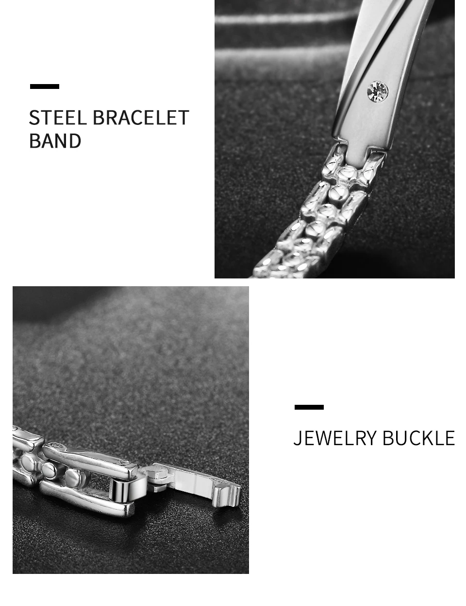 Материалы -Номер модели: BL0259 -Чехол из нержавеющей стали -Ремешок из нержавеющей стали -Импортированный японский movt -30 м водонепроницаемый -Кристаллы кубического циркония Размер -Диаметр чехла: 11,5 х23 мм -Толщина чехла: 11,5 мм -Ширина ремешка: 8 мм -Длина ремешка: 165-210 мм