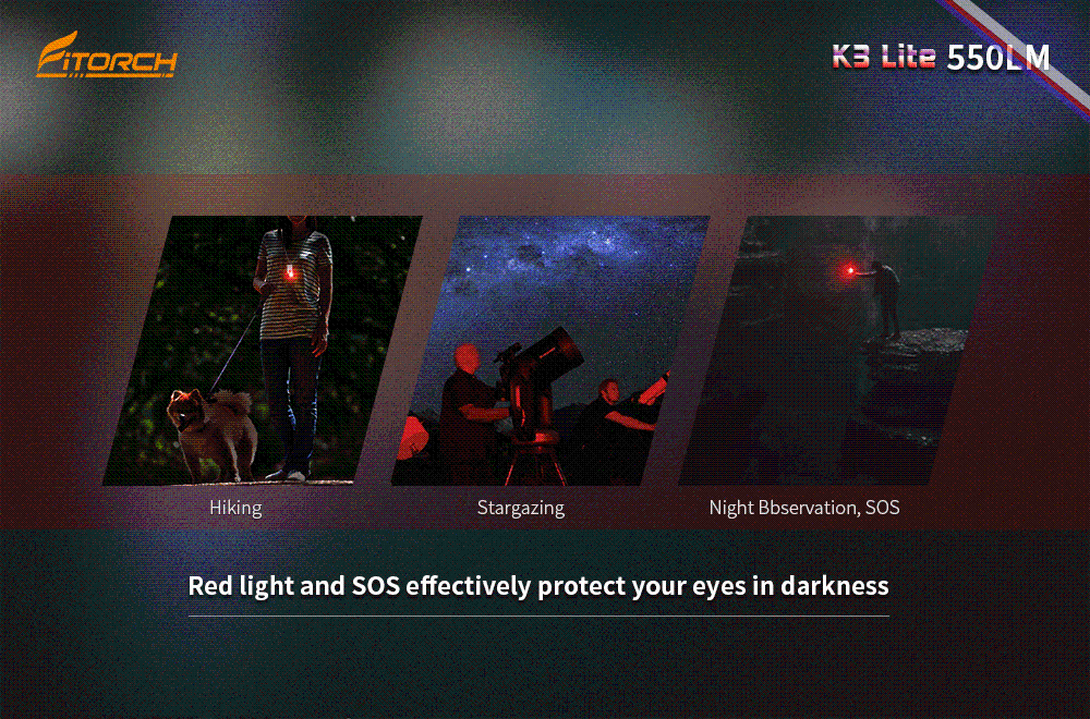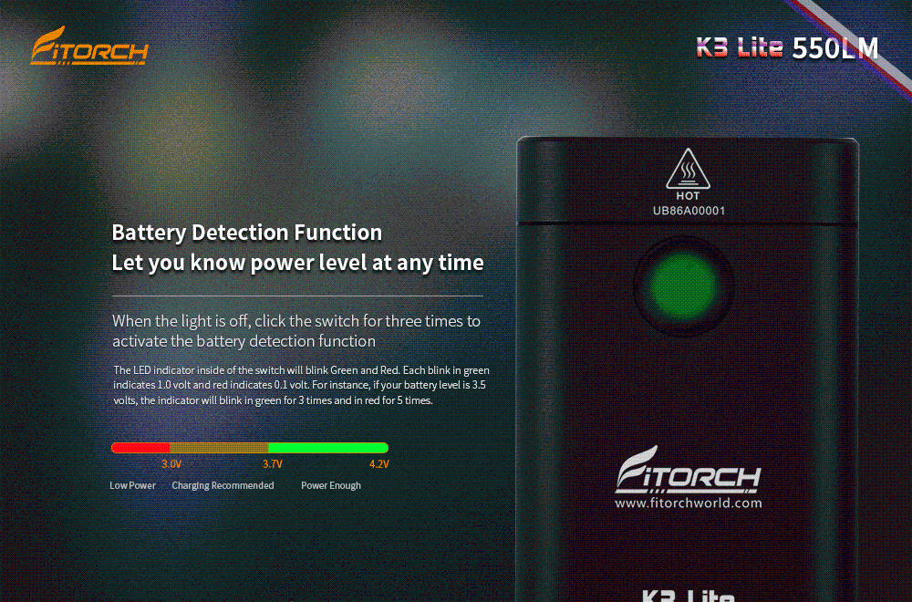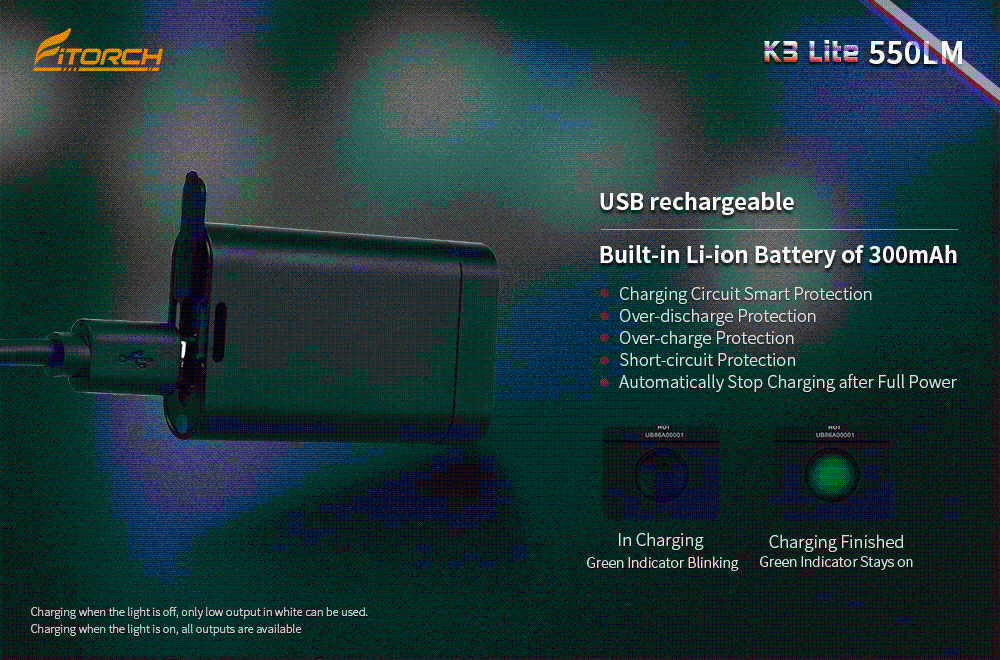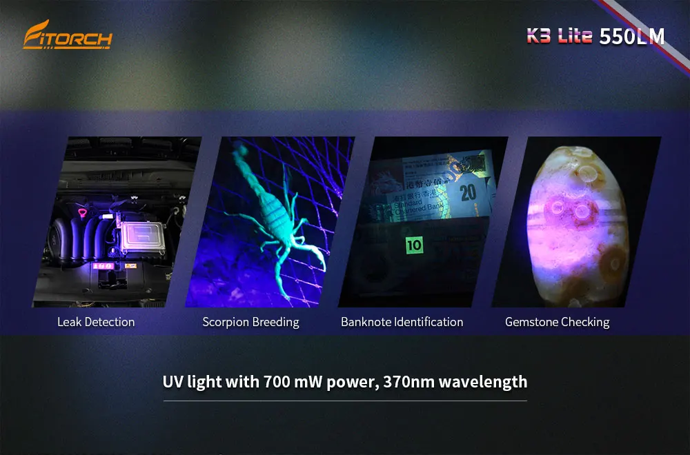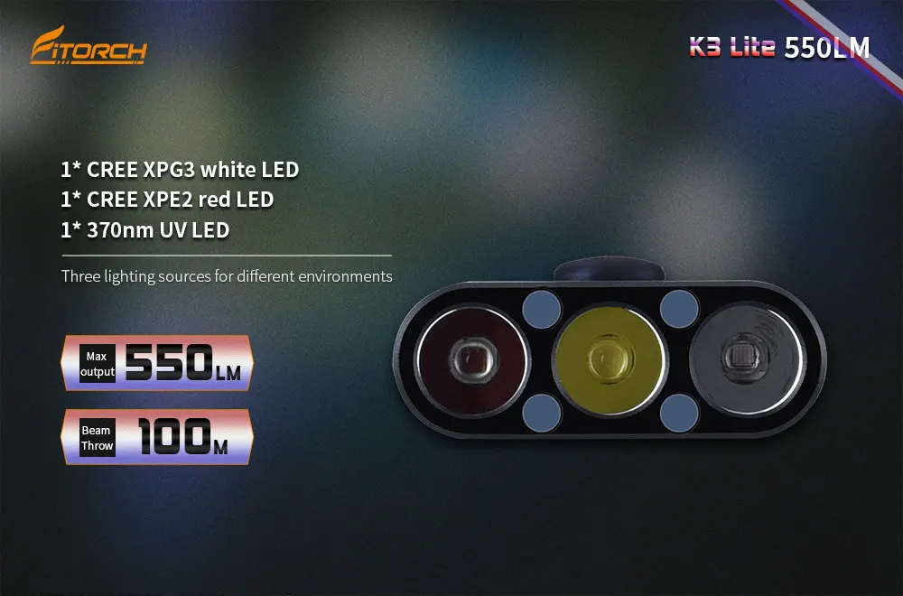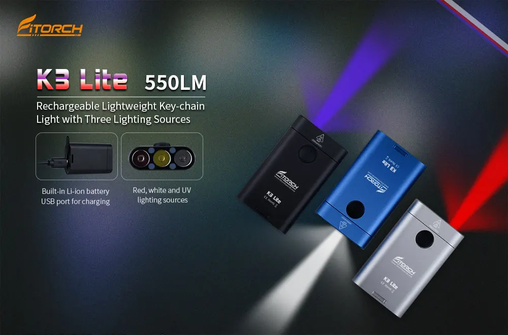 Бренд Fitorch K3 Lite Материал Алюминиевый корпус Светодиодный 1 * XPG2/XPG3 светодиодный + 1 * XPE2 красный светодиодный 1 * Высокая скорость 370nm УФ светодиодный Вход 2.8Vdc-4.2Vdc Выход Максимум 550 люмен Отражатель Точный металлический Снятый Стекло Пленочное минеральное стекло Корпус Премиальное твердоанодированное антиабразивное покрытие Переключатель Универсальный переключатель Размеры Д53*в30*В12, 4 мм Вес 26,2 г