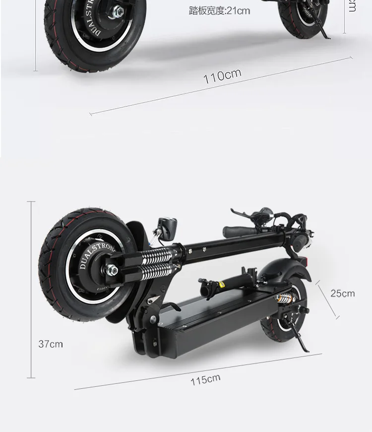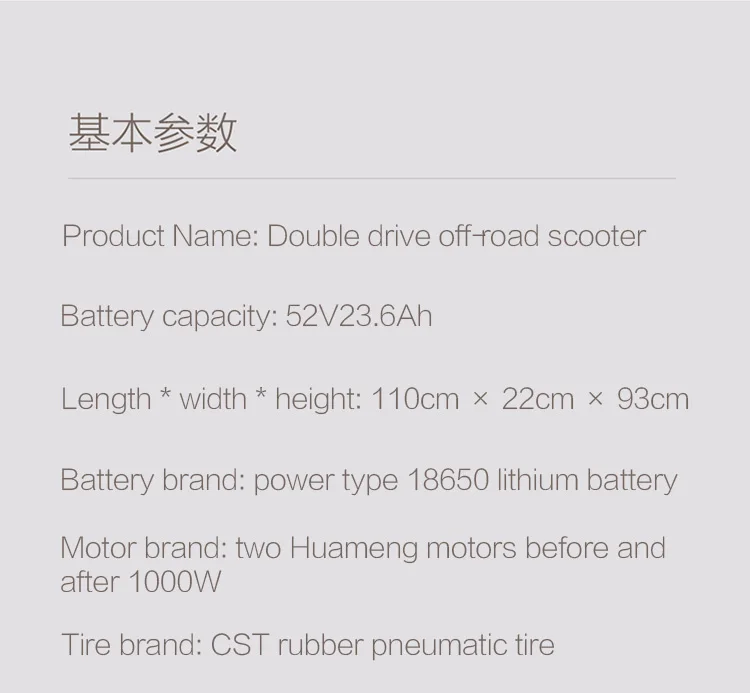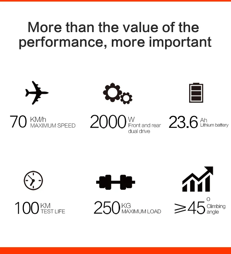 (1) передний и задний двухприводный независимый двигатель, мощность одного двигателя 1000 Вт, чтобы обеспечить вам мощную мощность. 2000 Вт колесный двигатель обеспечивает максимальную скорость 70 км/ч и максимальный градиент 35 градусов.