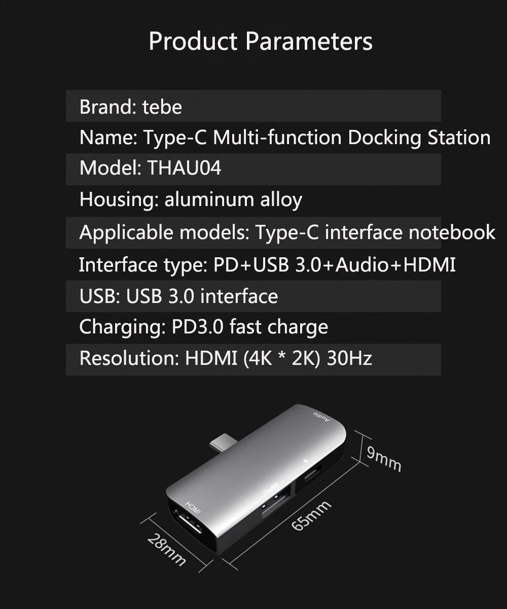 Typec к HDMI + аудио + USB + PD 4-в-1 док-станция Материал изделия: корпус из алюминиевого сплава Экран: Поддерживает обратную совместимость 4K * 2K Данные: быстрая передача данных USB3.0 Это Удлинительный кабель для передачи видео. Входное устройство имеет USB-C интерфейс для мобильных телефонов, планшетов, ноутбуков и т. д. Интерфейс USB-C имеет небольшой размер, поддерживает вставку вперед и назад, передачу данных и выход HDMI поддерживает до 1920X1080P/30 Гц. Разрешение видео, выходное устройство HD дисплей, ЖК-телевизор и т. Д. (требуется устройство с протоколом Type c) Характеристики производительности: 1. Принять EP9632G QFN76 PD + чип преобразования видео 1. Самое высокое разрешение 1920X1080P/30 Гц (требуется поддержка хоста дисплея) 2. Входной ток 5А, поддержка наивысшей скорости 5 Гбит/с 3. Нисходящая Совместимость с USB2.0/1,1 4. Соответствие USB-C Спецификации интерфейса 5. Встроенный чип преобразования, подключи и работай 6. Рабочая температура: 0 ~ 70 °C 7. Рабочая влажность: от 10% до 85% относительной влажности (без конденсации) 8. Размер продукта: 65*28,6*11,7 мм