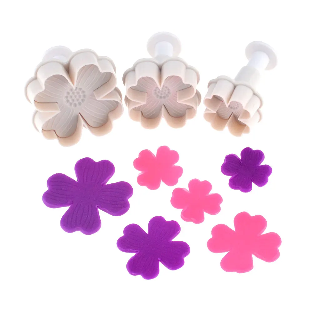 Описание: Новые 6 различных размеров плунжеры в форме цветка сливы. Высокое качество, безопасная для пищевых продуктов, нетоксичная, безвкусная. Можно использовать много раз и легко чистить (только ручная стирка). Плотно прижмите его, чтобы получить изображение, похожее на снег, потяните плунжер, чтобы получить его. Идеально подходит для использования с пирожными с помадой, сахарной пастой, лепестковой пастой, марципаном для приготовления пищи своими руками, печеньем или крафтовыми молями. Параметры продукта: Материал: пищевой пластик Цвет: белый Посылка включает в себя: 3 шт. резаки для торта