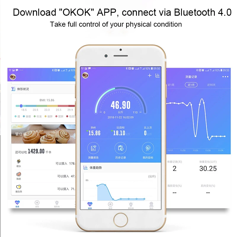 -Синхронизация с приложением для фитнеса-умные весы для тела с простой операцией, просто загрузите приложение «OKOK», подключите через Bluetooth 4,0.