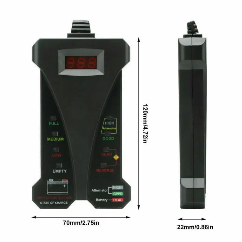1. Цифровой тестер батареи Вольтметр и анализатор системы зарядки с ЖК-дисплеем и светодиодный индикатор обеспечивают быстрое считывание, чтобы определить, нужен ли аккумулятор транспортного средства прыжок или замена.