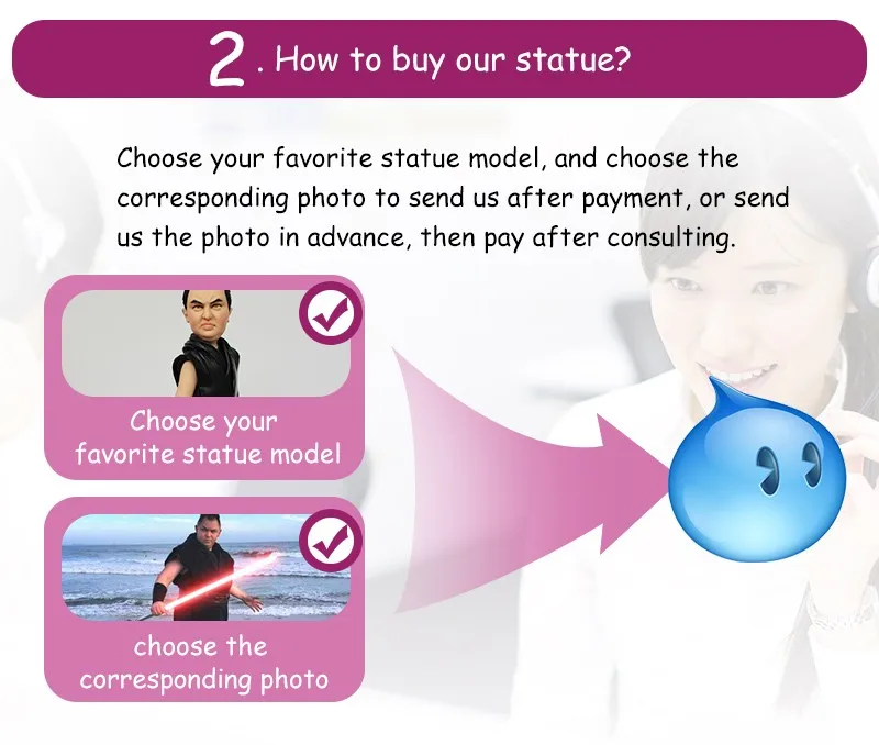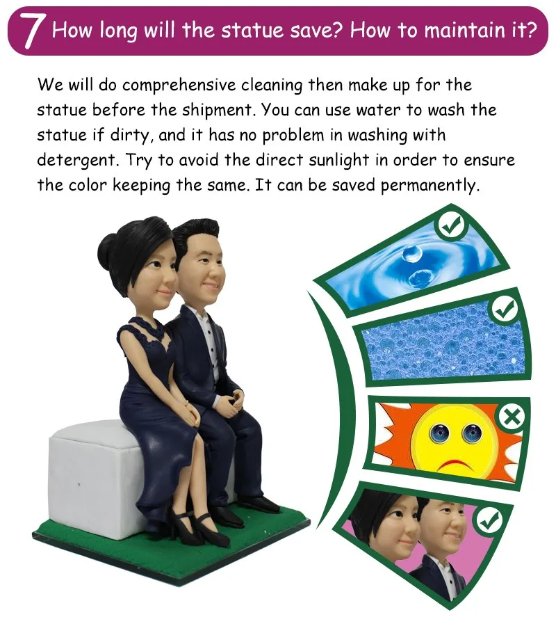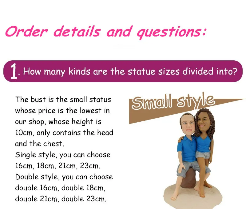 100% изготовление на заказ: Мы персонализируем лица, тела, одежду, прически, цвет глаз и волосы фигуры, которую вы спросите у нас. Вы можете добавить детали, объекты, сценария, надписи и т. Д. Подарки для всех видов мероприятий: мы делаем фигурки свадеб, причастий, дней рождения, юбилеев, профессий, спорта, хобби, домашних животных, детей, знаменитостей... Все возможно! Вдохновлено фотографиями: мы работаем через фотографии. Отправьте ваши фотографии по электронной почте или в коробке сообщений, и мы сообщим вам с первого момента без каких-либо обязательств.