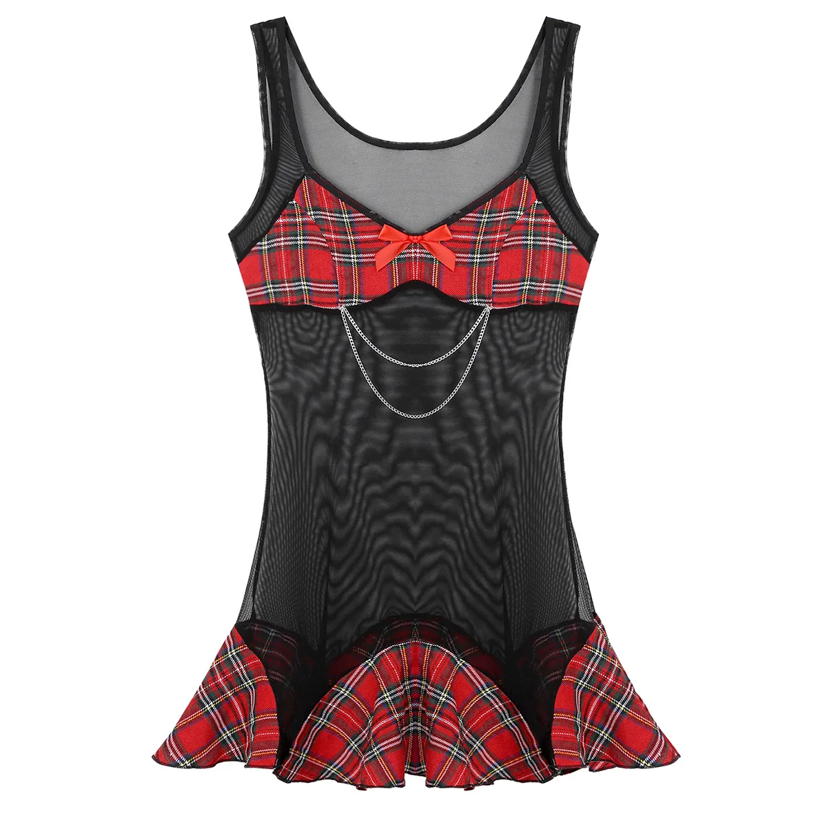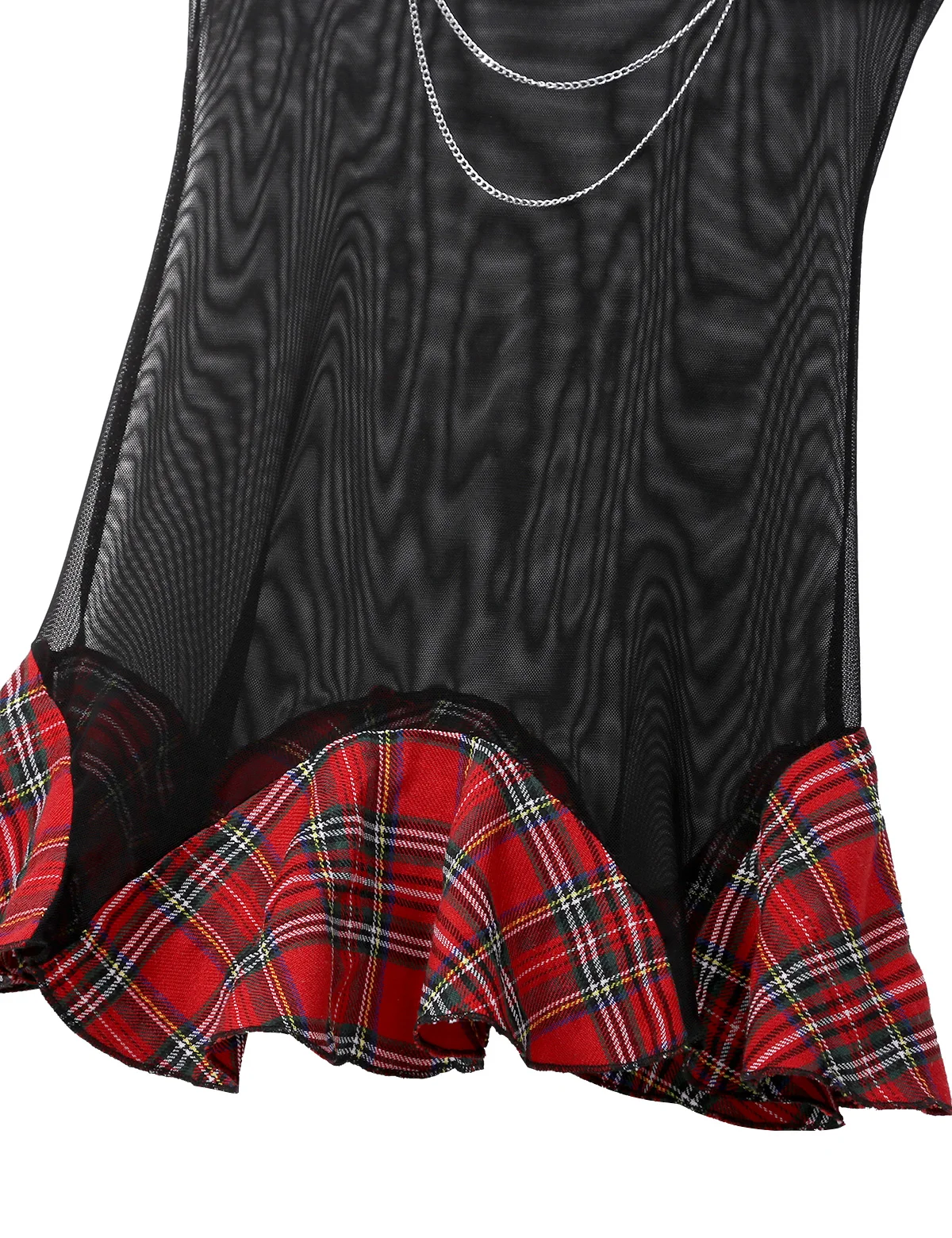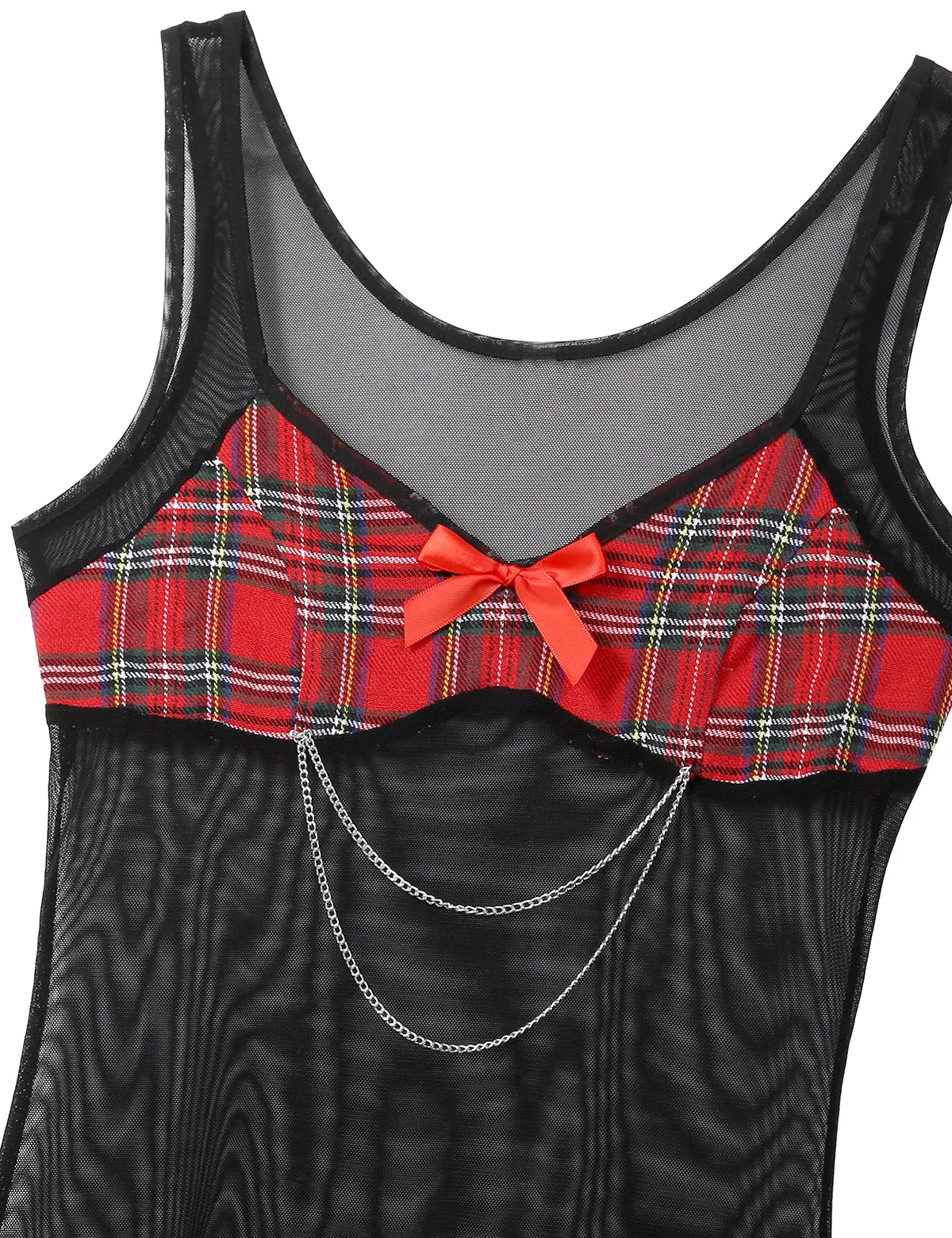 С глубоким v-образным вырезом и без рукавов, клетчатая грудь украшена металлической цепочкой и клетчатым подолом, длиной выше колена.