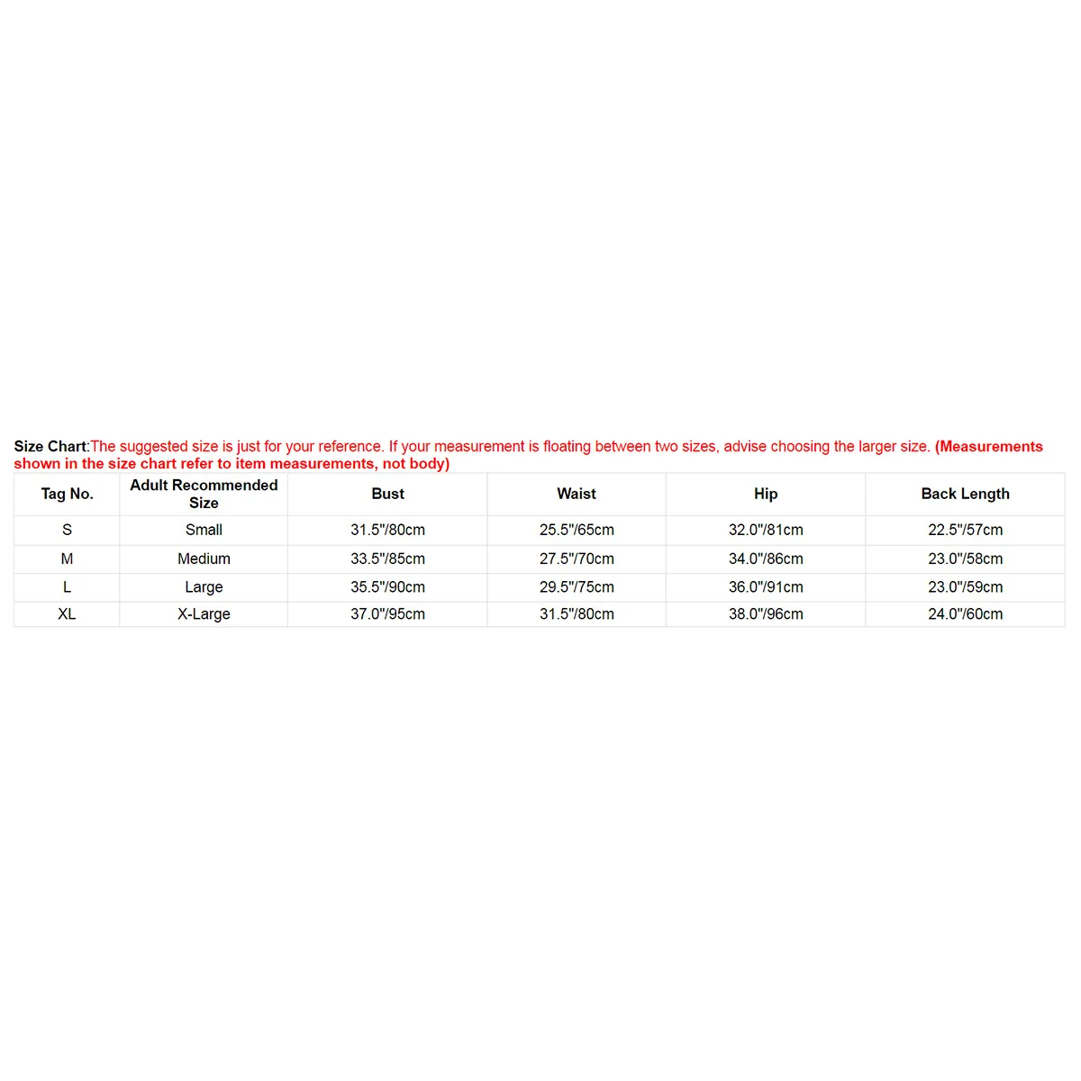 Размер на бирке. Взрослый рекомендуется Размеры Обхват груди Обхват талии Обхват бедер Задняя Длина S Маленький 31,5 "/80 см 25,5 "/65 см 32,0 "/81 см 22,5 "/57 см М Средний размер 33,5 "/85 см 27,5 "/70 см 34,0 "/86 см 23,0 "/58 см L Большой 35,5 "/90 см 29,5 "/75 см 36,0 "/91 см 23,0 "/59 см XL X-большой 37,0 "/95 см 31,5 "/80 см 38,0 "/96 см 24,0 "/60 см Полезные советы: Замеры делаются вручную, поэтому учитывайте небольшие погрешности. Цвет на фото может немного отличаться от реального товара из-за особенностей цветопередачи различных мониторов.