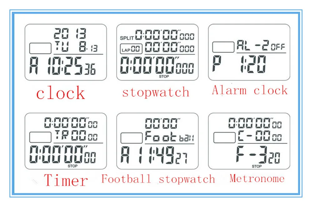 Основная функция: секундомер, круг/Сплит, отзыв/набор, старт/стоп, футбол, память