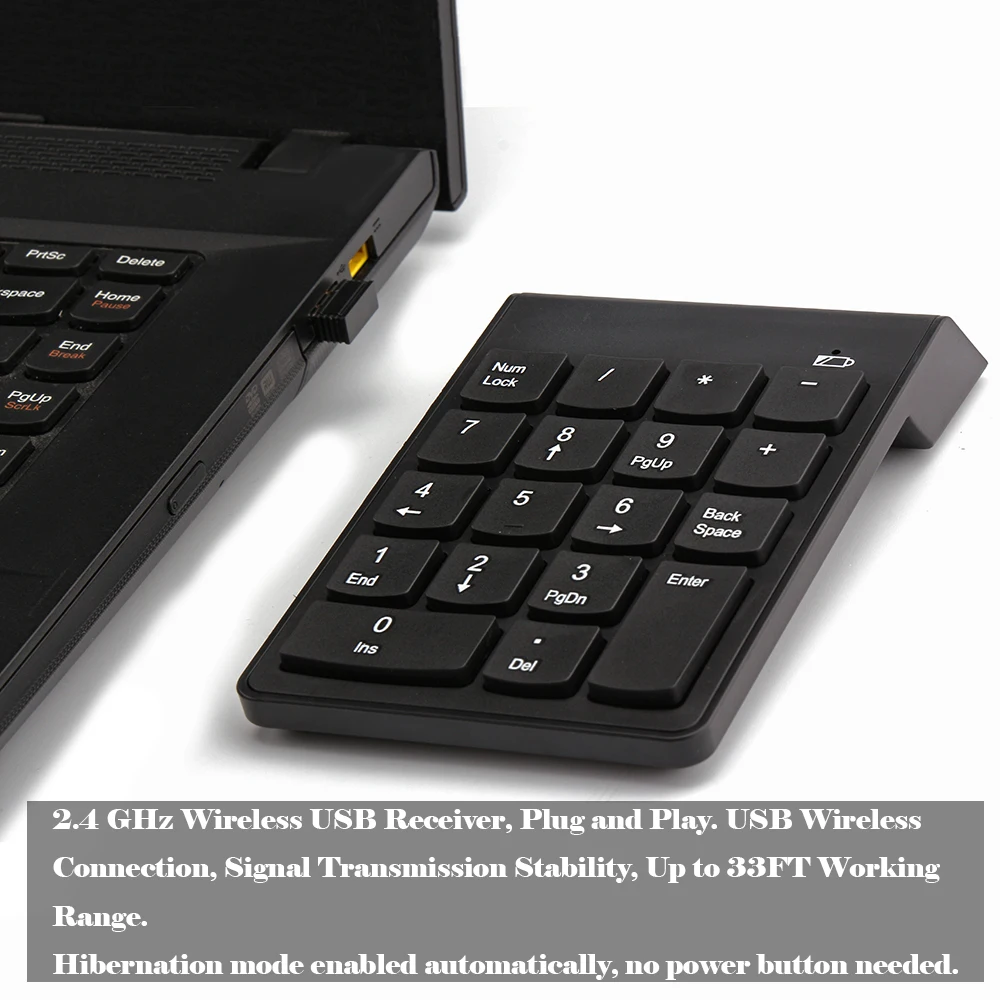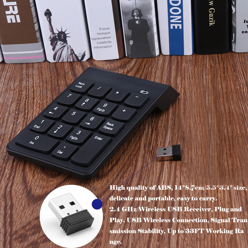 Цифровая клавиатура включает 18 полноразмерных кнопочных колодок и вогнутых клавиш, включая нумлок/заднюю часть/вход/конец/вставка/удаление/PgUp / PgDn, отличный аксессуар для небольших ноутбуков без отдельной клавиатуры.