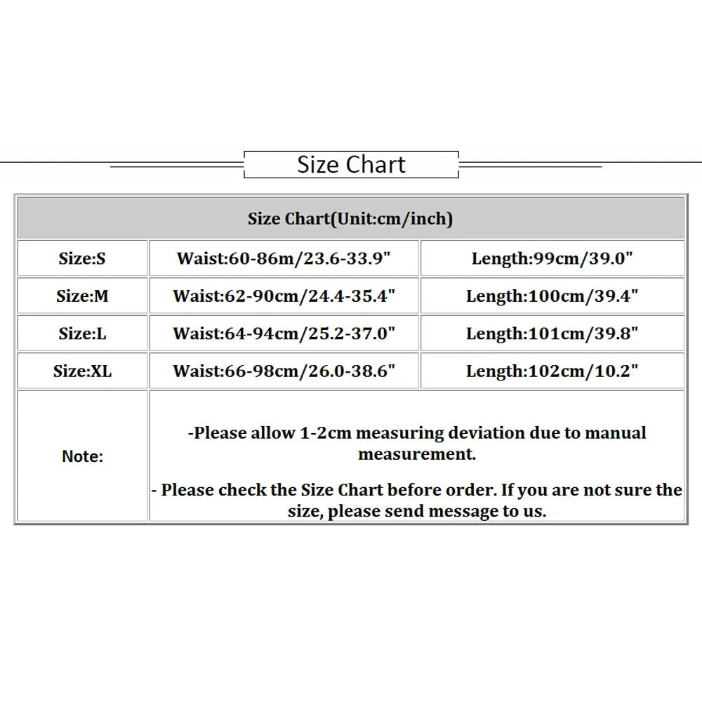 Таблица размеров (единица измерения: см/дюйм) Размеры: S Талия: 60-86 м/23,6-33,9" Длина: 99 см/39,0 дюйма Размеры: М Талия: 62-90 см/24,4-35,4" Длина: 100 см/39,4" Размеры: L Талия: 64-94 см/25,2-37,0" Длина: 101 см/39,8" Размеры: XL Талия: 66-98 см/26,0-38,6" Длина: 102 см/10,2" Примечание:-Замеры сделаны вручную, поэтому возможны отклонения на 1-2 см.