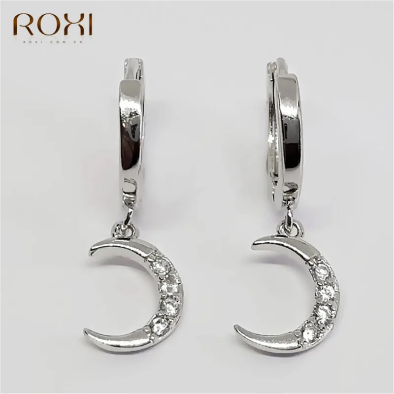 Женские асимметричные серьги-гвоздики ROXI, серьги из стерлингового серебра 925 пробы с изящной Луной и звездой из кубического циркония, Модная бижутерия, серьга с рождественской тематикой, подарок