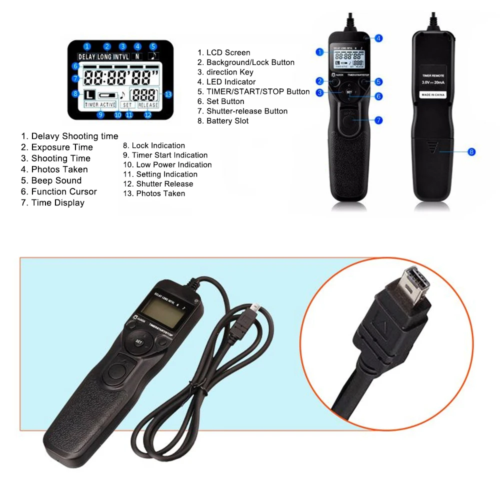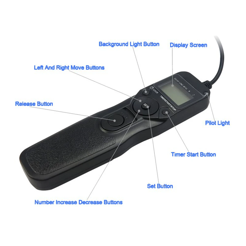 1.Work as original MC-DC2 2.Press it halfway down to achieve focus 3.Press it complete down to take pictures 4.Shutter release lock (for long exposures) 5.Timer delay: 0s to 99hrs 59min 59s in 1s increments Exposure time: 0s to 99hrs 59min 59s in 1s increments Interval: 0s to 99hrs 59min 59s in 1s increments