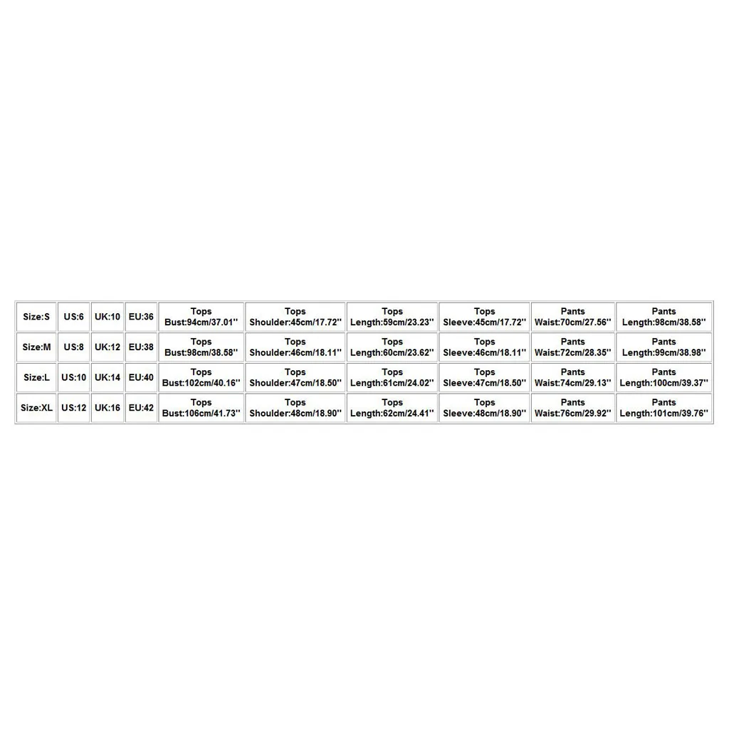 Размеры Свяжитесь с нами Великобритания ЕС Топы на груди Обхват плеч Топы Длина Футболки с короткими рукавами Штаны с резинкой на талии Брюки Длина S 6 10 36 94 см/37,01'' 45 см/17,72'' 59 см/23,23'' 45 см/17,72'' 70 см/27,56'' 98 см/38,58'' М 8 12 38 98 см/38,58'' 46 см/18,11'' 60 см/23,62'' 46 см/18,11'' 72 см/28,35'' 99 см/38,98'' L 10 14 40 102 см/40,16'' 47 см/18,50'' 61 см/24,02'' 47 см/18,50'' 74 см/29,13'' 100 см/39,37'' XL 12 16 42 106 см/41,73'' 48 см/18,90'' 62 см/24,41'' 48 см/18,90'' 76 см/29,92'' 101 см/39,76''
