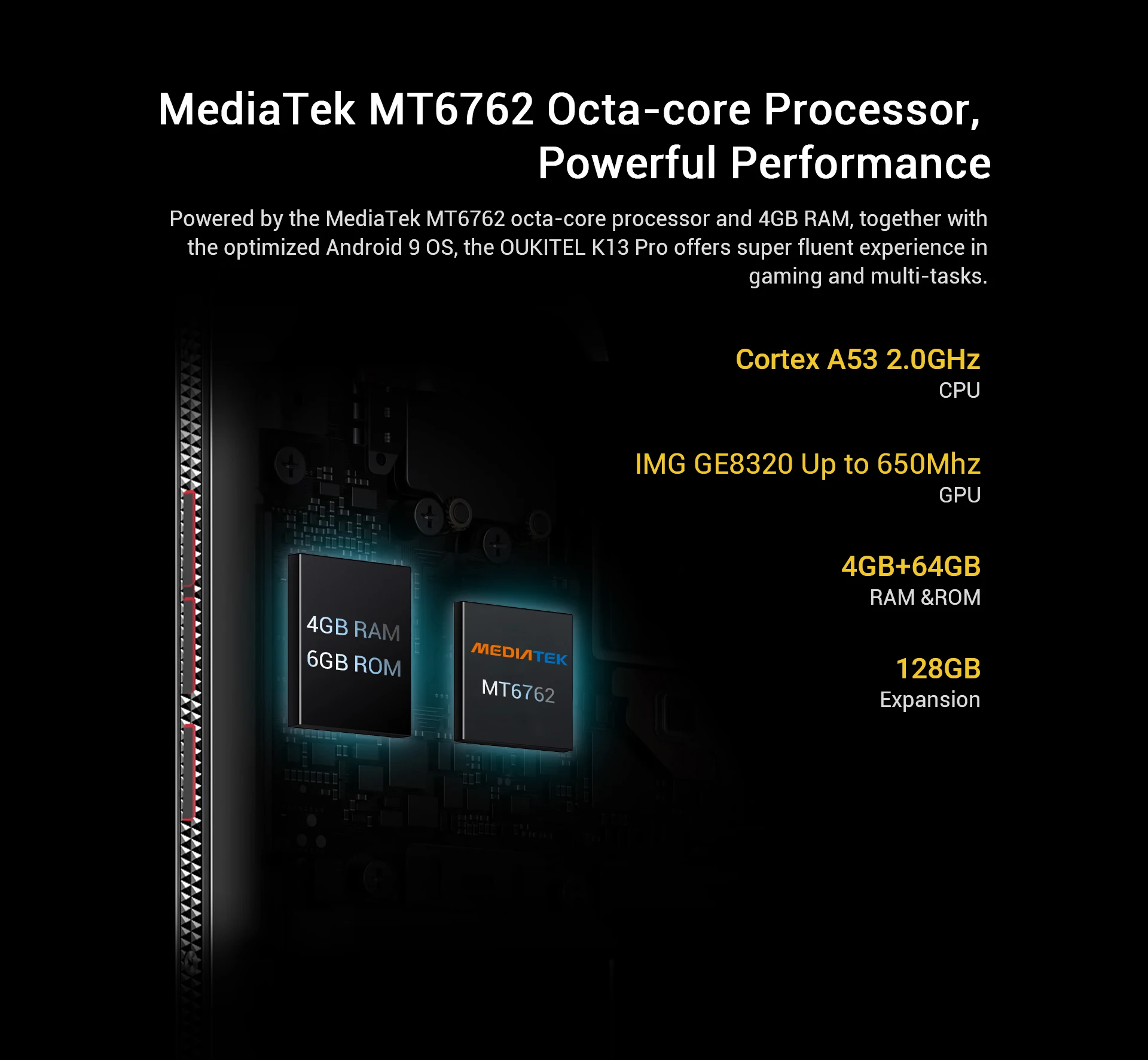 Дисплей: 6,41 дюйма Экран: 19,5: 9 Процессор: MT6762 Количество ядер процессора: Octa Core ОЗУ: 4 Гб ROM: 64 ГБ Аккумулятор: 11000 мАч Отпечатков пальцев: Поддержка Сеть: GSM/WCDMA/LTE ОС: Android 9,0 Фронтальная камера: 8.0MP Задняя камера: 16.0MP + 2.0MP Поддержка распознавания лиц и отпечатков пальцев Поддержка NFC OTG OTA Поддержка