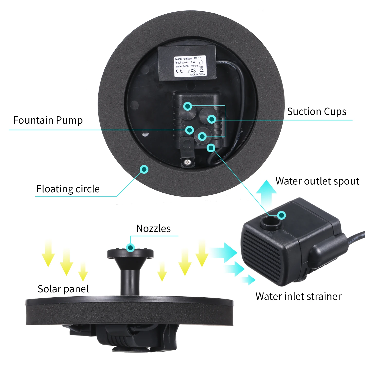 Этот комплект водяных насосов на солнечной батарее с 4 насадками позволяет вам выбирать различные водные узоры по желанию. Работает на солнечной батарее, не требуется батарея или электричество. Получите фонтан, плавающий на воде, затем он будет работать автоматически в 3s, когда будет воздействие солнечного света. Подходит для ванны с птицами, аквариума, маленького пруда, украшения сада, циркуляции воды для кислорода и т. д.