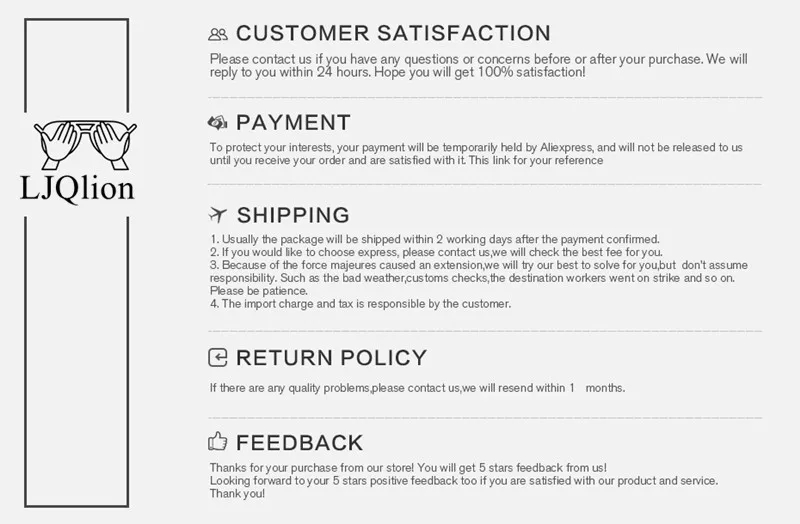 1. Доставка осуществляется в течение 1-2 дней после оплаты. Следуйте инструкциям нашего магазина и получите больше скидок. 2, дропшиппинг + Сервис логотипа: Прямая поставка и печать логотипа, что вам нужно. 3. Оптовые продажи: чем больше количество, тем больше скидок, более 8 штук за один раз, вы можете связаться с нами, чтобы получить больше скидок. 4, предлагаем оптовую доставку через CSV файл (Файл Excel)
