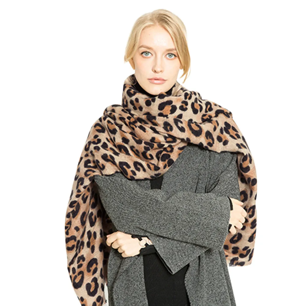 Женский зимний теплый длинный шерстяной шарф с леопардовым принтом, мягкий длинный шарф