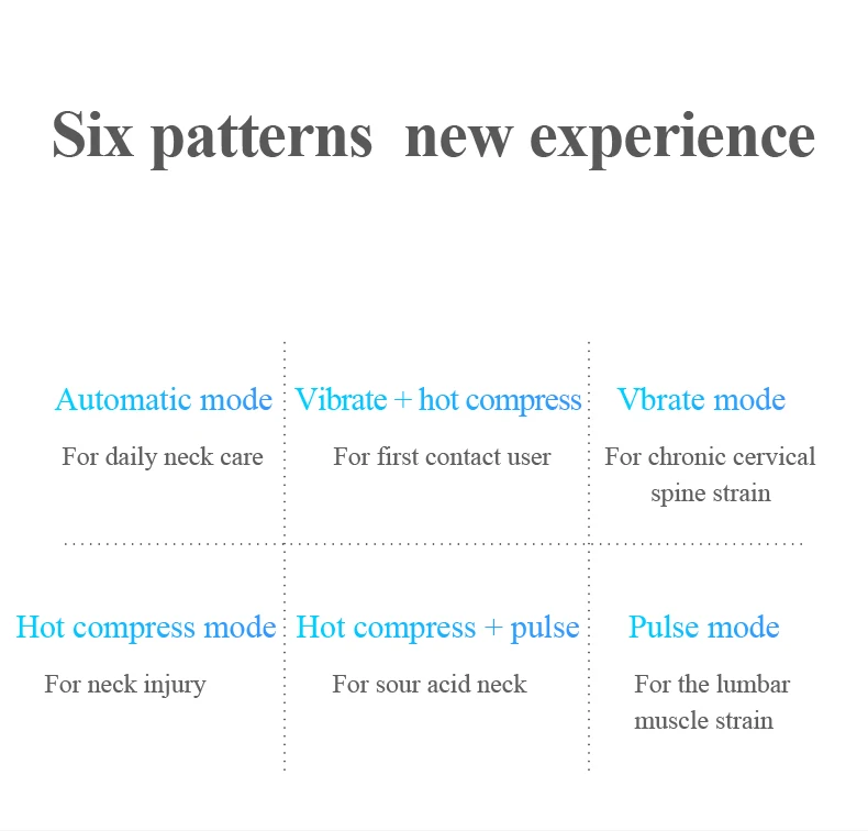 1. Автоматический режим (Ежедневный уход за горлом) 2. Вибрирует и сжимает (Первый раз в использовании) 3. Режим вибрации (Хроническое напряжение шейного отдела позвоночника) 4. Режим горячего сжатия (Травма шеи) 5. Горячий компресс и пульс (Горлышко кислой кислоты) 6. Импульсный режим (Напряжение поясничной мышцы)