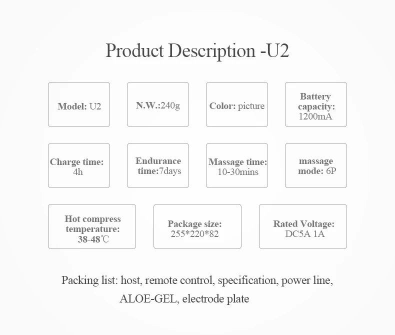 Модель: U2 Вес нетто: 620 г Цвет: белый Емкость аккумулятора: 1200ма Время зарядки: 4 часа Время выдержки: 7 дней время массажа: 10-30 минут Режимы массажа: 6P температура горячего сжатия: 38-48 ℃ Размер посылка: 24,1x20,8x7,2 см Номинальное напряжение: DC5A 1A