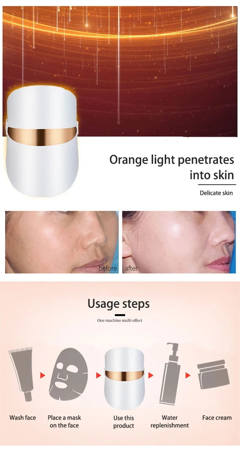 1. 3 цвета светодиодный маска может решить проблемы с кожей, такие как лечение акне и восстановление шрамов от акне. 2. Повышение коллагена и подтяжка кожи, уменьшение и Предотвращение морщин, помогает борется с жирными участками. 3. Используйте около 20 минут каждый день и может уменьшить ваши тонкие линии и морщинки вокруг лба и глаз всего за 4-6 недель. 4. Фотоновое косметическое устройство, предназначенное для украшения лица, использует естественный светильник, который передается светодиодами в кожу. Светильник активирует фоторецепторы в клетках кожи, производя энергию для поглощения компонентами кожи, чтобы украсить ваш цвет лица.