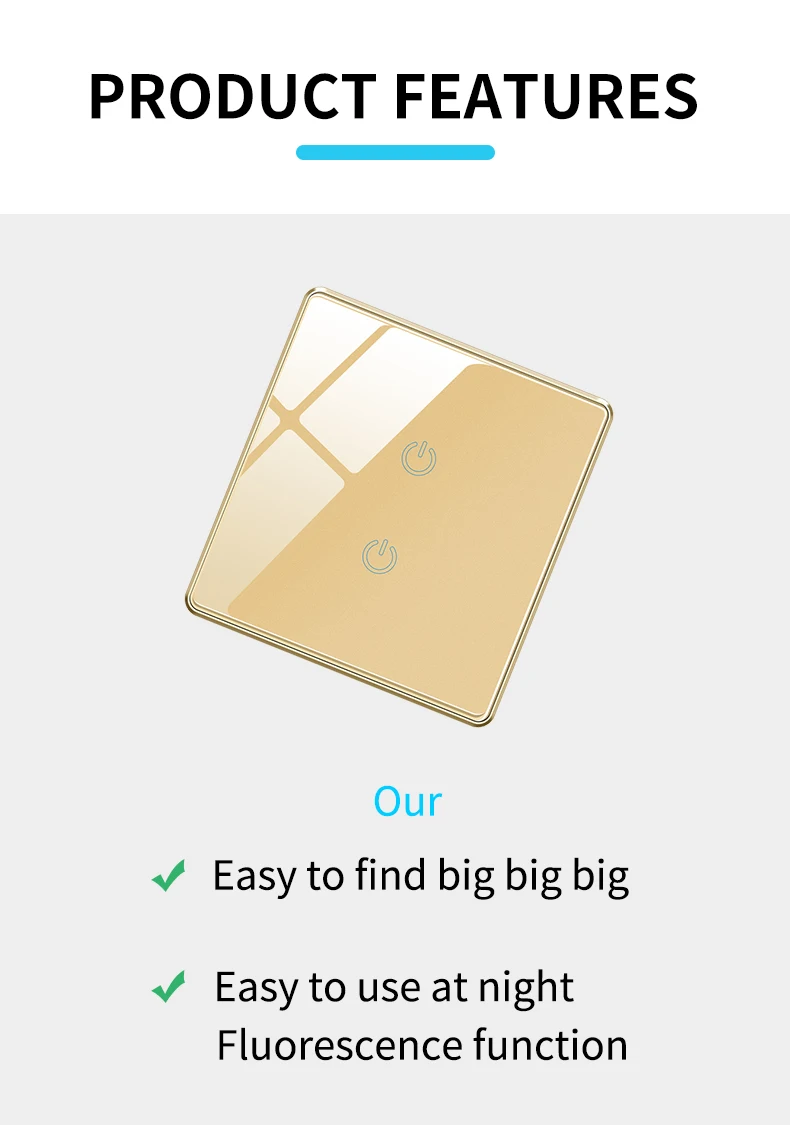 Стекло панель переключателя Переключатель состоит из панели из закаленного стекла и световой индикатор, который является гладким и чувствительным, простым в использовании для пожилых людей и детей Современная мода делает ваш дом модным и эффектным Удобный светильник, питание может управляться сенсорной кнопкой, очень удобный Высокотемпературное обнаружение, хорошая пожарная безопасность и устойчивость Светящийся светильник, синий мягкий световой светильник, позволяет легко использовать переключатель в ночное время Не беспокоить для сна Легко моется, стекло панели устойчиво к деформации и выцветанию Простота в обслуживании и очистке Передовое импортное оборудование и технология, полученная национальная сертификация ccc, более безопасная и надежная