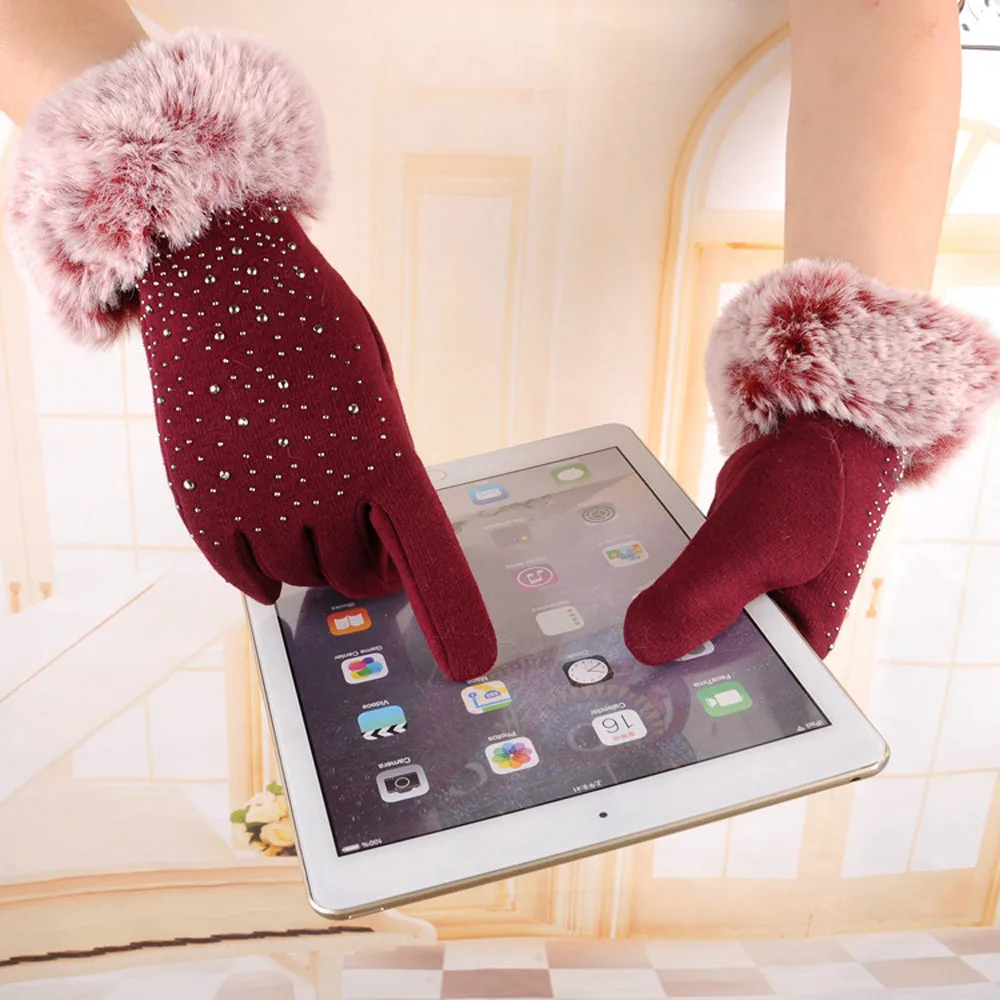 Стразы, плюшевые перчатки, женские, с сенсорным экраном, утолщенные, меховые, из искусственного меха, хлопковые перчатки, для улицы, для вождения, Женские варежки, Rekawiczki Zimowe