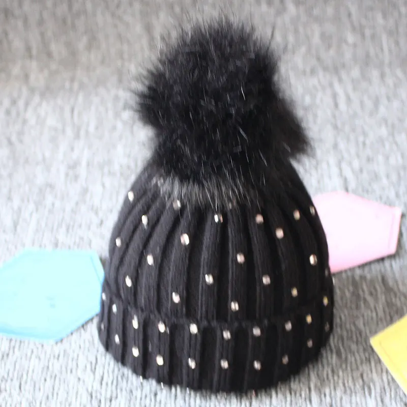 Для новорожденных мальчиков и девочек вязаная шапочка зимняя теплая большой меховой шарик шляпа с пайетками