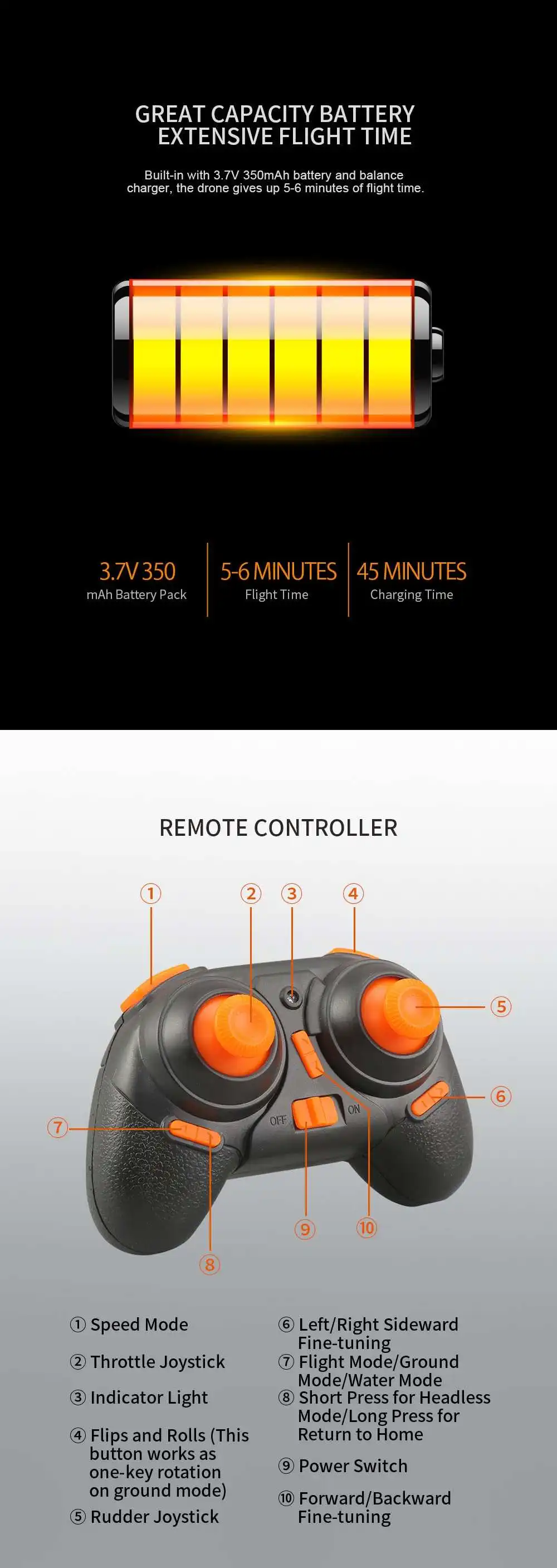 Функция:Вверх/вниз, вперед/назад, поворот влево/вправо, боковой полет, режим воздушного полета (только самолет), режим наземного вождения, серфинг над водным режимом, 3-уровневая скорость полета, безголовый режим, автоматический возврат одной кнопкой, поворот на 360 °, Автоматическая сигнализация