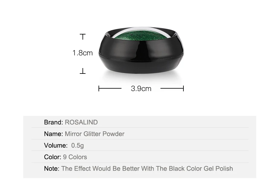 Технические характеристики: • Материал: порошок * Цвет: Золотой, серебристый * коробка Размеры: 2,8x1,5 см (нижняя Диаметр x высота) * стержень со спонжем Длина: 5,2 см * порошок Ёмкость: 10g Особенности: * Используйте этот порошок, чтобы создать блестящий зеркальный эффект для ваших ногтей * цветовой эффект нейл-арта будет отличаться от базового цвета (напоминание: эффект черного базового цвета лучше.) * Каждая коробка поставляется с губчатой палочкой для легкой эксплуатации * только без очистки верхнее покрытие может получить зеркальный эффект Пункт включает в себя: 1 x зеркальный хромированный порошок для ногтей 1 x губчатая палочка