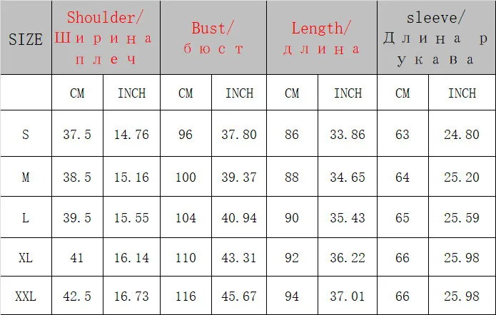 Наши размеры основаны на азиатском рынке, а не на размерах ЕС или США. Мы предлагаем выбрать на 2 размера больше вашего обычного размера пальто. Кроме того, все измерения производятся вручную, поэтому, пожалуйста, учитывайте погрешность. Если у вас есть вопросы о размерах, пожалуйста, свяжитесь с нами.