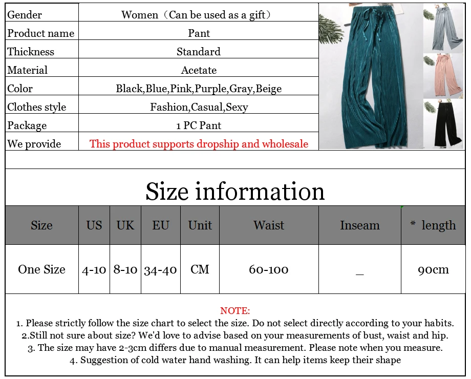 Информация о продукте: Особенности: высокая талия, эластичная резинка на талии, брюки, летние и весенние брюки, повседневные брюки. Материал: ацетат, высококачественный полиэстер, чистый, дышащий, воздушный и легкий модный стиль, удобный на ощупь. Стиль: модные и повседневные брюки с высокой эластичной резинкой на талии, свободный крой, идеально подходит для дома или сна, как пижамные штаны, отдыха или активного отдыха Повод: свидания, вечерние, пляжные, свадебные, для работы, дома и многое другое. Подходит для лета и весны. Обратите внимание: ручная стирка. Вся наша одежда предназначена для азиатской фигуры, что означает, что она будет меньше, чем обычные европейские размеры. Пожалуйста, обратитесь к нашей собственной таблице размеров, и вы можете найти ее на наших фотографиях или в описании. Что вы получаете: 1 шт. женские брюки.