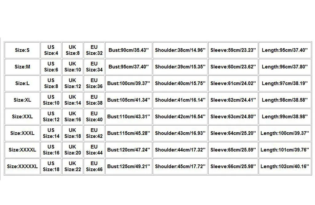 РазмерыНам РазмерыUK РазмерыЕС РазмерыОбхват грудиСумка на плечоРукаваДлинаS483290 см/35,43''38 см/14,96''59 см/23,23''95 см/37,40''М6103495 см/37,40''39 см/15,35''60 см/23,62''96 см/37,80''L81236100 см/39,37''40 см/15,75''61 см/24,02''97 см/38,19''XL101438105 см/41,34''41 см/16,14''62 см/24,41''98 см/38,58''XXL121640110 см/43,31''42 см/16,54''63 см/24,80''99 см/38,98''XХХL141842115 см/45,28''43 см для ухода за ребенком для мам/16,93''Высота голенища 64 см; 25,20''100 см/39,37''XXXXL162044120 см/47,24''44 см/17,32''65 см/25,59''101 см/39,76''XXXXXL182246125 см/49,21''45 см/17,72''66 см/25,98''102 см/40,16''
