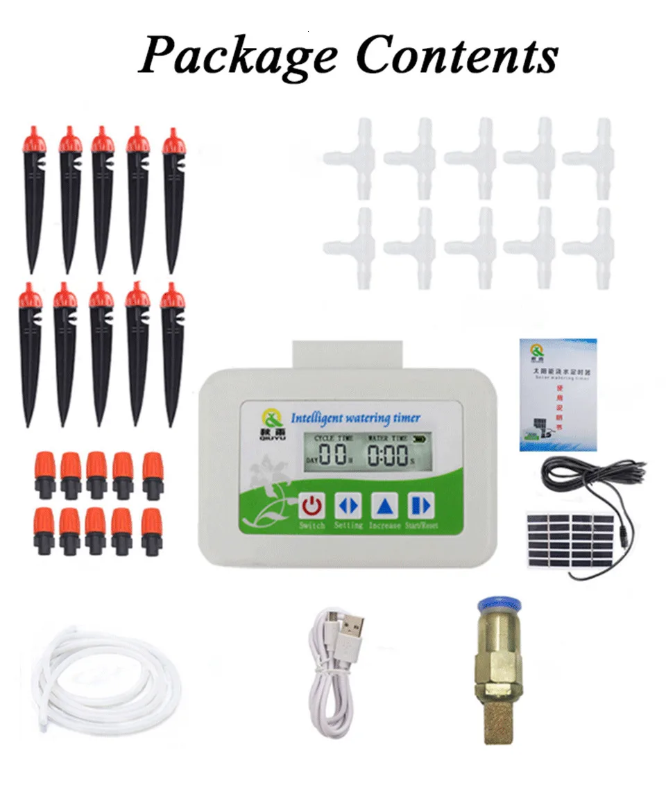Посылка в комплект входит: host 1 шт./Солнечная плата 1 шт./капельная стрелка 10 шт./спринклер 10 шт./водный тройник 10 шт./водопровод 10 м/линия зарядки 1 шт./фильтр 1 шт./Инструкция 1 шт.