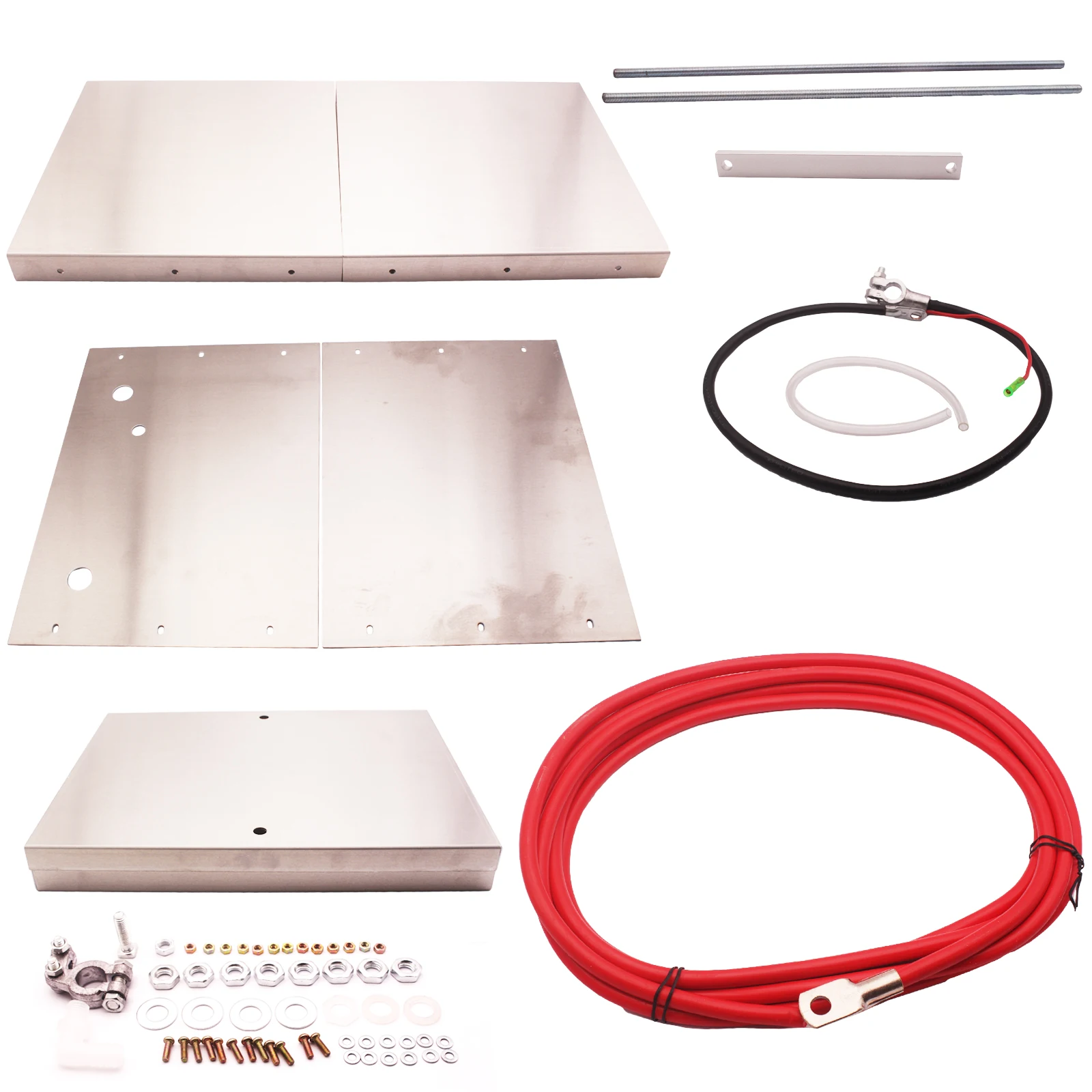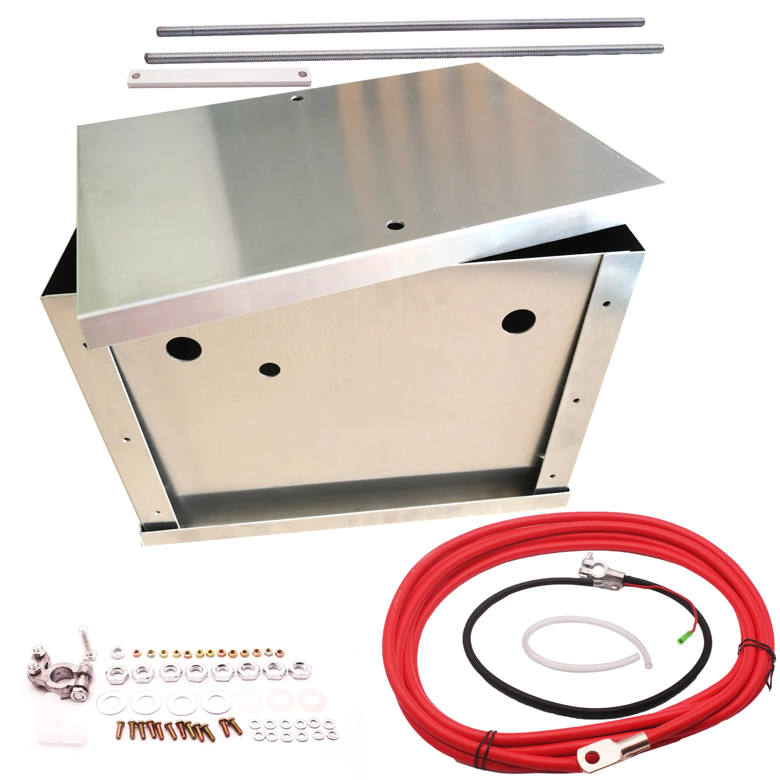 Description - Satin Finish - 3/8" - .375 Thick ( Strongest Hold Down Bracket ) - 8.1 NHRA Legal - Strongest / Lightest Kit ( 4.5lbs ) - Mounting Hardware Included - Clear PVC Protective Film Coating ( Exclusive Feature ) - 4' Feet of 4 Gauge Negative Wire - 16' Feet of 2 Gauge Positive Wire - Box Dimensions 13.5" x 10" x 10" - Above Dimensions = Width x Length x Height We offer a fully sealed box that will handle every application from street to race vehicle and custom truck or suv applications. This is a true bolt in kit for your vehicle. Kit comes complete with battery connections and performance wire positive and negative battery cable. Not import or cheap cable like many other kits include. Hardware includes stainless steel threaded rod not cheap metal bars or low end hardware like all the big companies sell. The breather fitting, breather tube, grommets and battery hold down with wing nuts for an easy install. Fits these Vehicles: Universal Battery Box System can be installedin any vehicle. Without Question the highest quality battey box system available