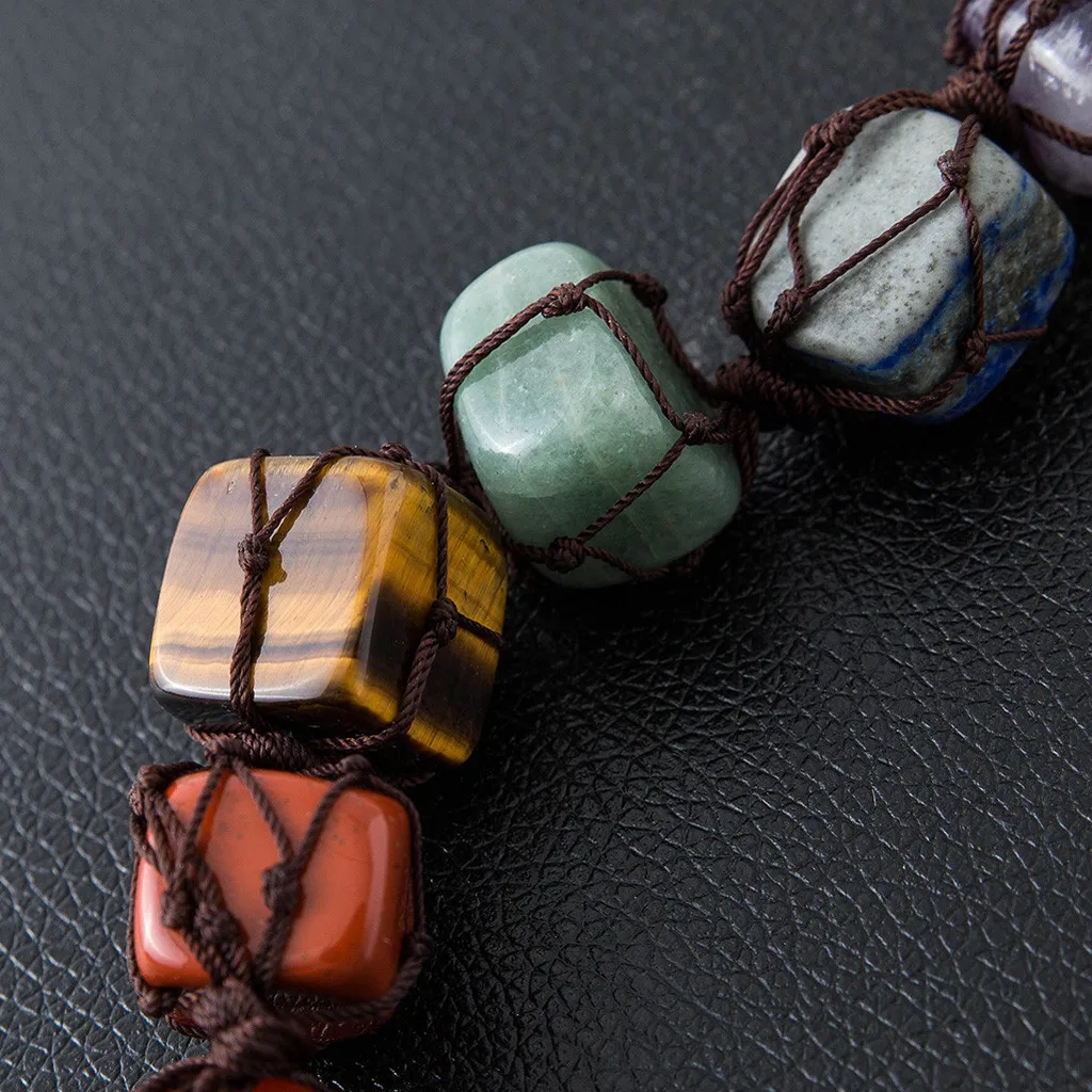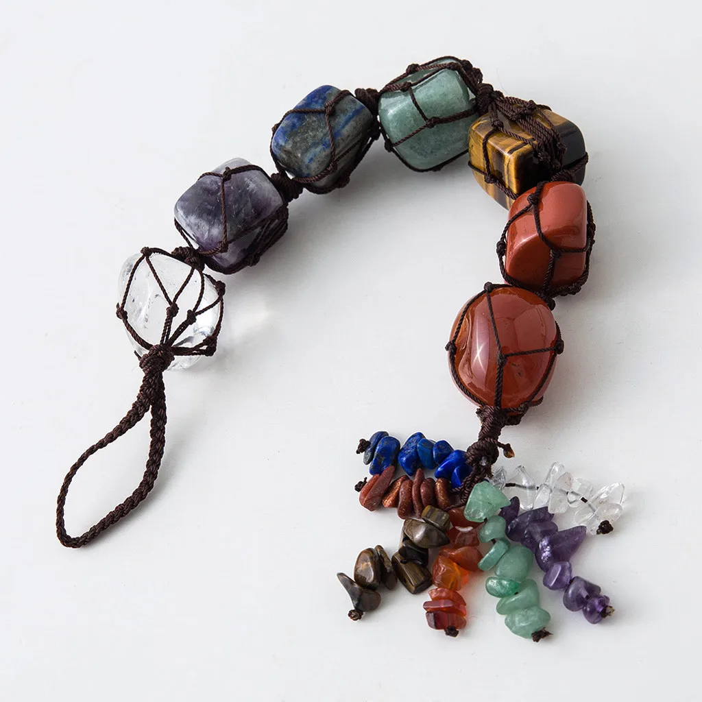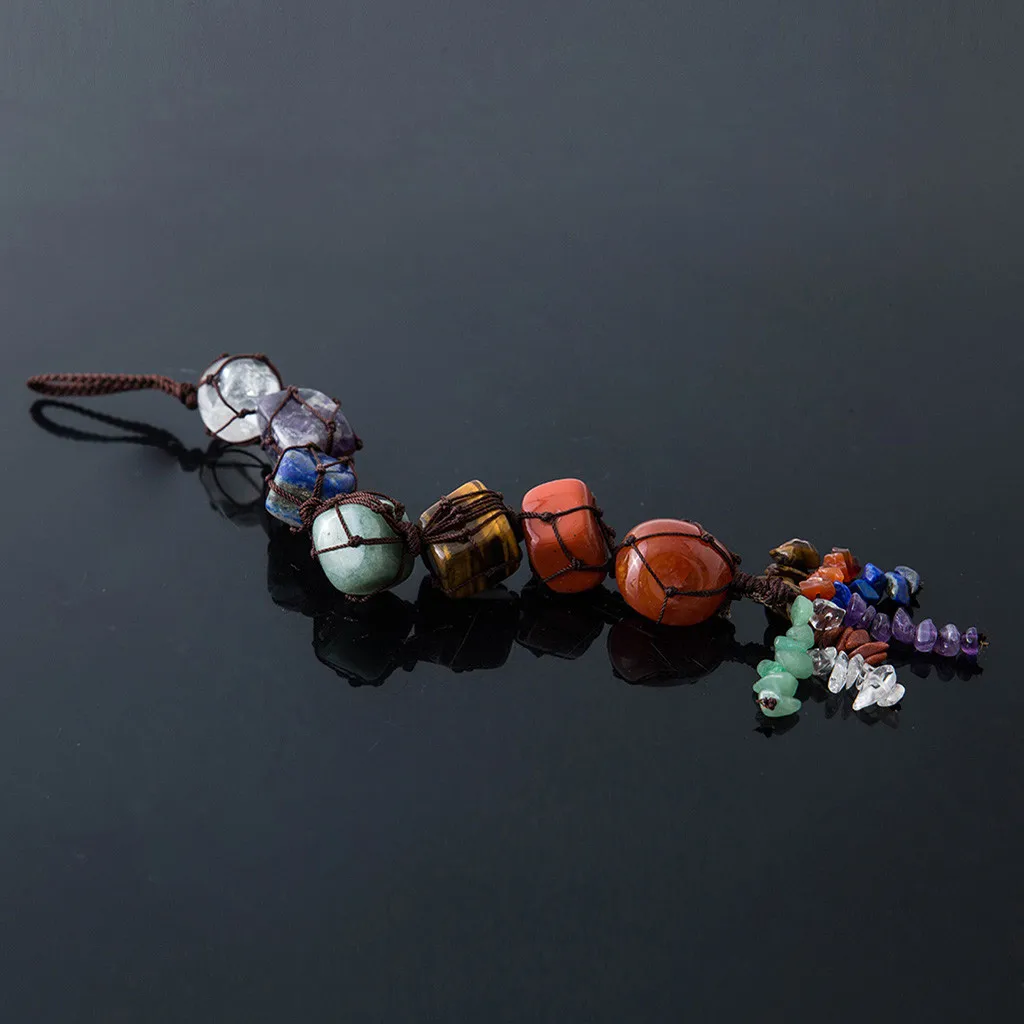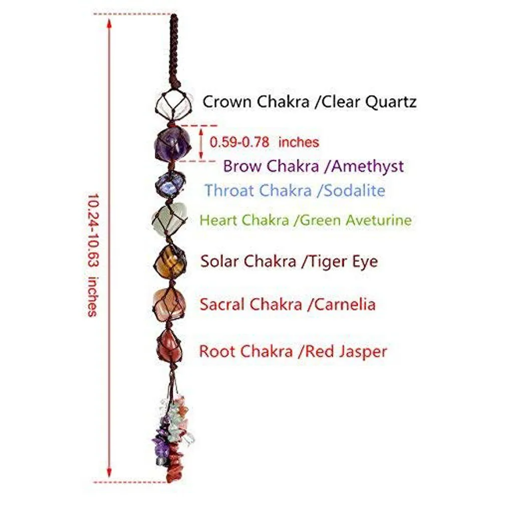 7 Chakra Tumbled Gemstone Tassel Hanging/Feng Shui Ornament Stones Car Decor Product Description: --7 CHAKRA Tumbled & Chipped Gemstones FROM TOP TO BOTTOM RESPECTIVELY:Clear Crystal Quartz,amethyst,sodalite,green aventurine,tiger eye,Red Agate,Red Jasper --Tumbled stones size range:15-30mm,chipped stones size range:5-10mm. Tassel Length:25-28cm.