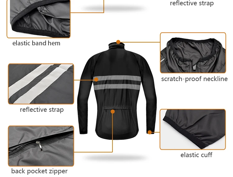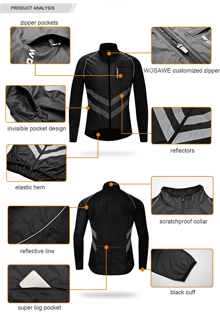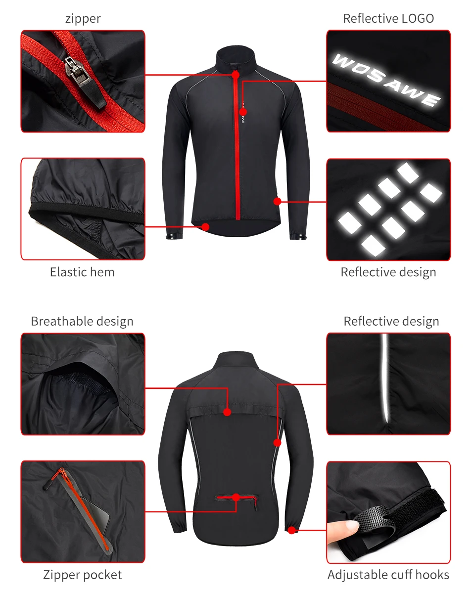 Особенности: * Легкая Техническая ткань ветрозащитная и водоотталкивающая * Ветрозащитный воротник-стойка * Полная длина молнии * Эластичная резинка на рукавах и низкий подол хорошо сидят * Светоотражающие полосы окружают ваше тело, чтобы обеспечить безопасность ночной езды * Длинная задняя часть * Светоотражающий логотип WOSAWE Пол: мужчин